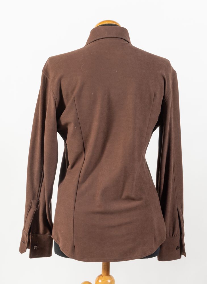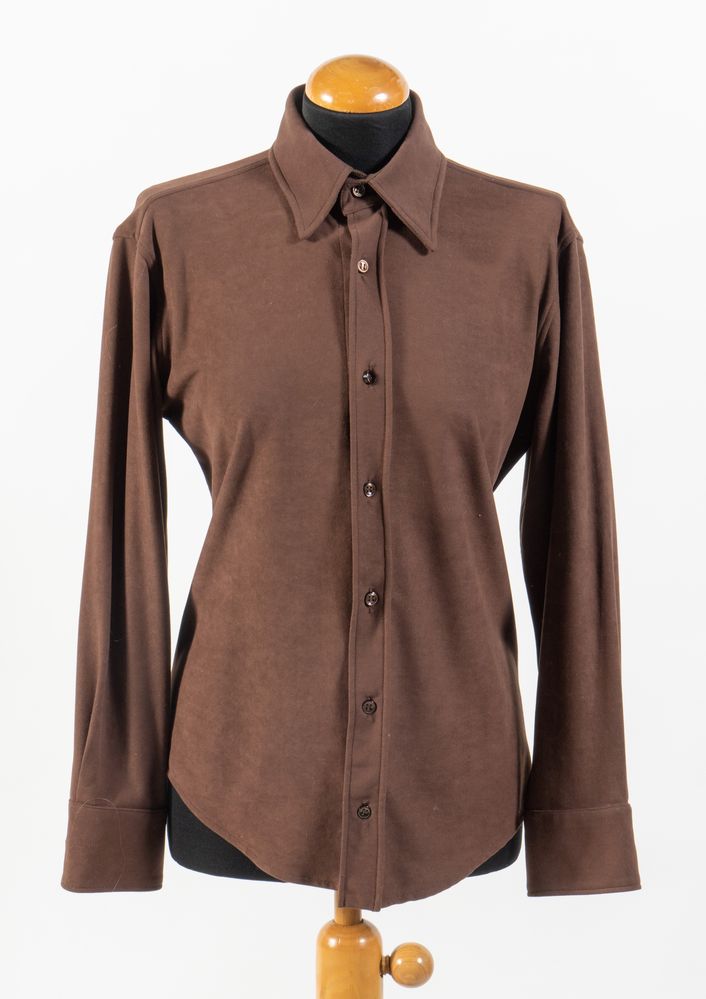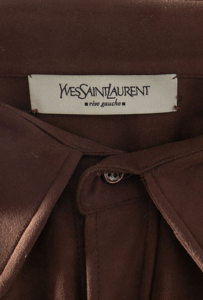YVES SAINT LAURENT Rive Gauche Camicia in tessuto marrone effetto scamosciato. Taglia non riportata. Composizione: 62% acetato, 29% poliammide e 9% elastane. Reca etichetta Yves Saint Laurent Rive Gauche. (Lievi difetti)