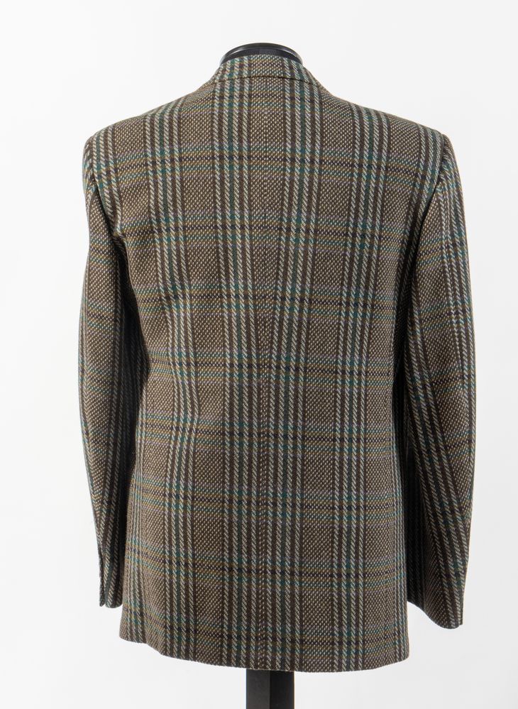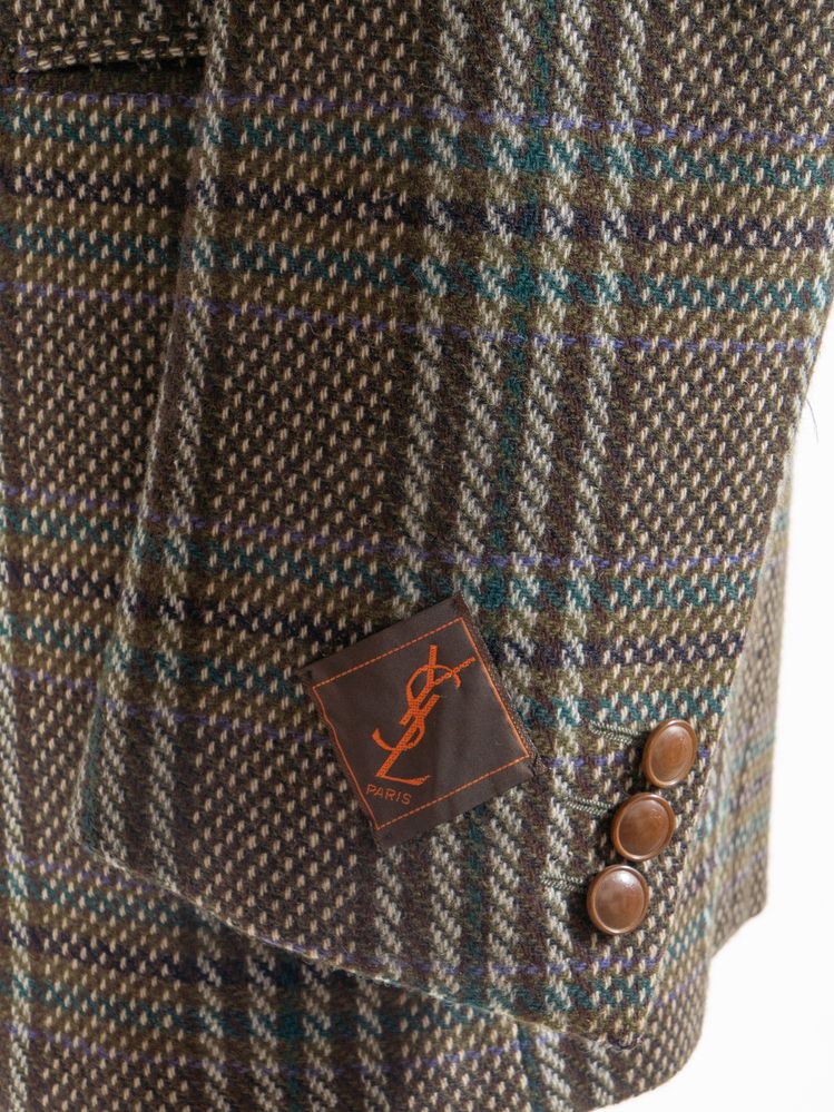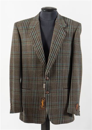 YVES SAINT LAURENT Diffusion Homme Giacca maschile in lana e cashmere con fantasia quadrettata sui toni del verde e del marrone. Riporta taglia 50. Interno rifinito con fodera logata. Composizione: 85% lana e 15% cashmere. Reca etichetta Yves Saint Laurent, Made in Italy, YSL e cartellino con dettagli e specifiche del prodotto.