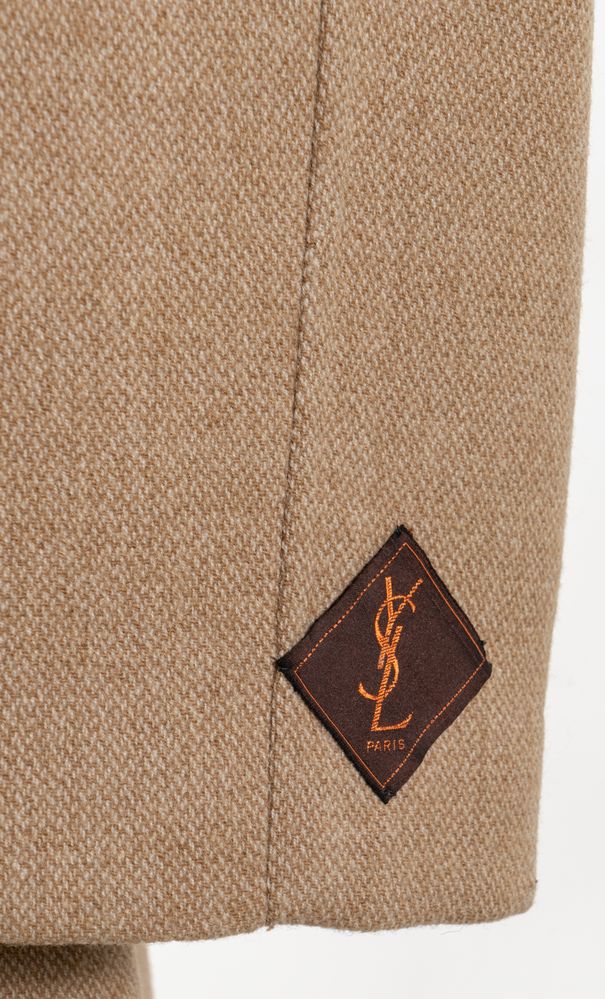 YVES SAINT LAURENT Diffusion Homme Cappotto maschile lungo con cintura color beige melange. Riporta taglia 50. Composizione esterno: 75% lana e 25% alpaca. Composizione fodera interna: 100% cupro. Reca marchio YSL ed etichetta Yves Saint Laurent. Accompagnato da cartellino originale con dettagli e specifiche del prodotto.