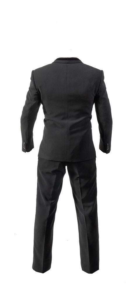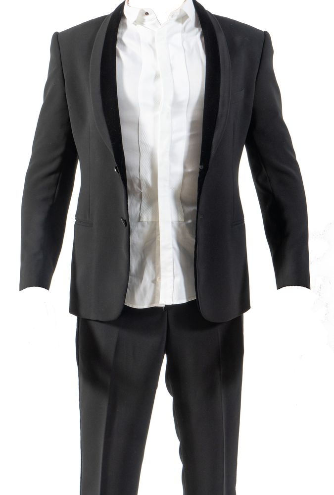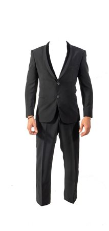 GIORGIO ARMANI Completo composto da giacca e pantaloni neri con rifiniture in velluto. Riporta taglia 46. Composizione esterno: 90% poliestere e 10% elastane. Composizione fodera interna: 65% viscosa, 30% cupro e 5% elastane. Ciascun elemento reca etichetta Giorgio Armani Made in Italy. (Lievi difetti)