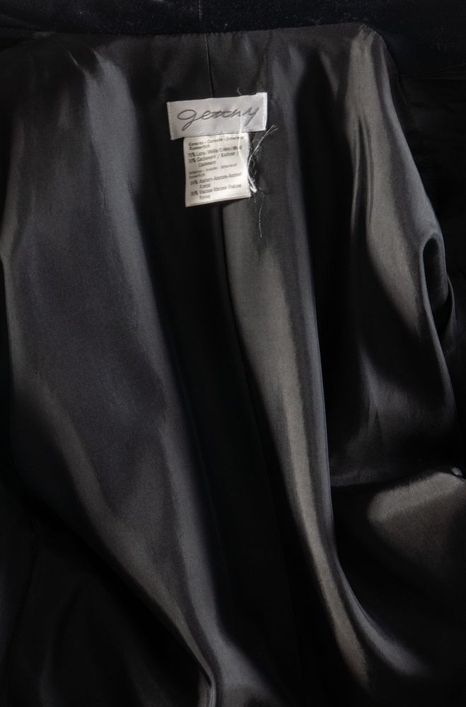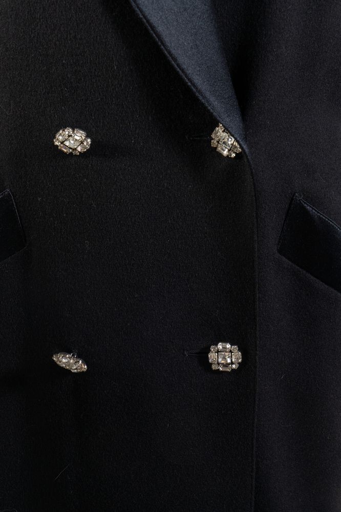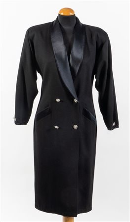 GENNY Cappotto doppiopetto in lana nera con colletto in seta arricchito da bottoni gioiello. Riporta taglia IT 40. Composizione esterno: 70% lana e 30% cachemire. Composizione fodera interna: 64% acetato e 36% viscosa di rayon. Reca etichetta Genny.