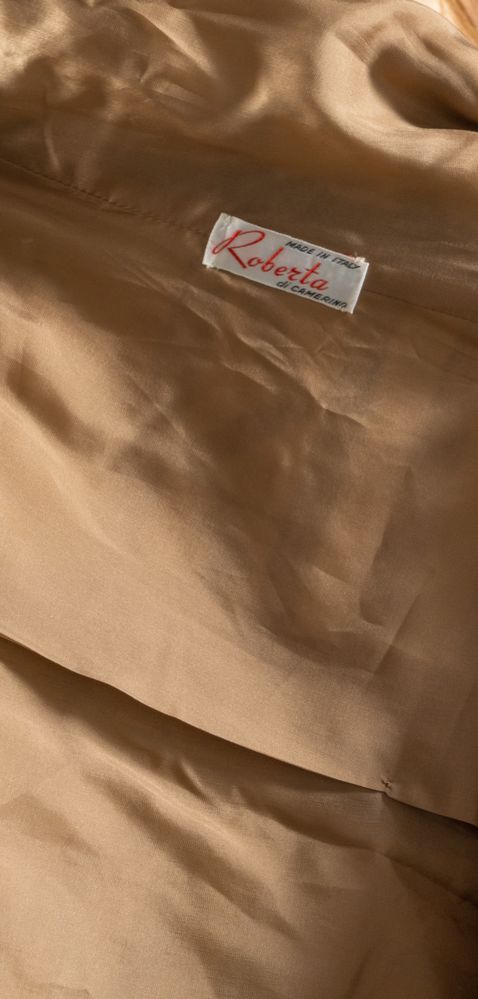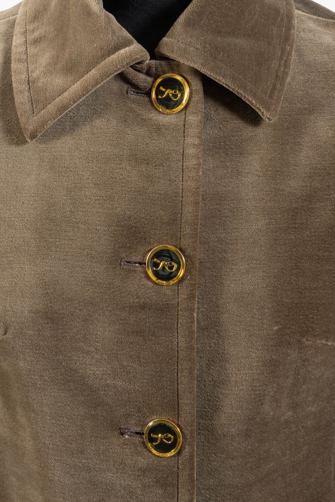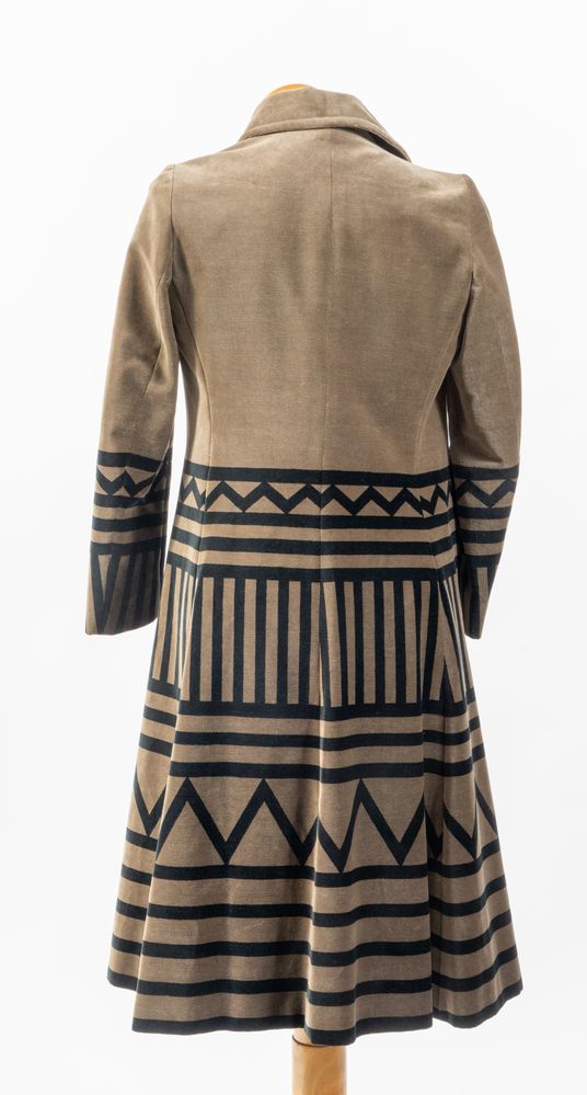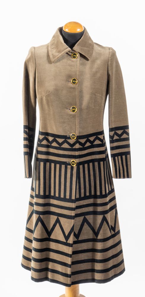 ROBERTA DI CAMERINO Soprabito in velluto sui toni del taupe con dettagli geometrici sui toni del nero e bottoni gioiello logati. Taglia non riportata: 42-44 circa. Reca etichetta Roberta di Camerino Made in Italy. (Lievissimi difetti)
