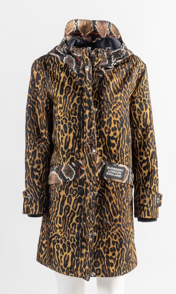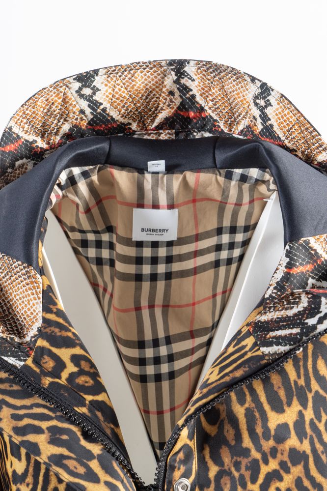 BURBERRY Impermeabile modello Cramond in cotone a fantasia animalier. Reca cappuccio e dettagli delle taschi in fantasia pitonata. Internamente foderato di tessuto check. Collezione Resort 2020. Riporta taglia IT 36. Composizione: 100% poliestere. Reca marchio ed etichetta Burberry London England.