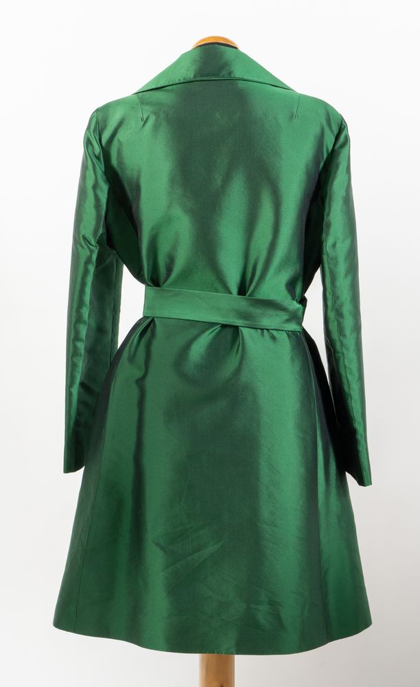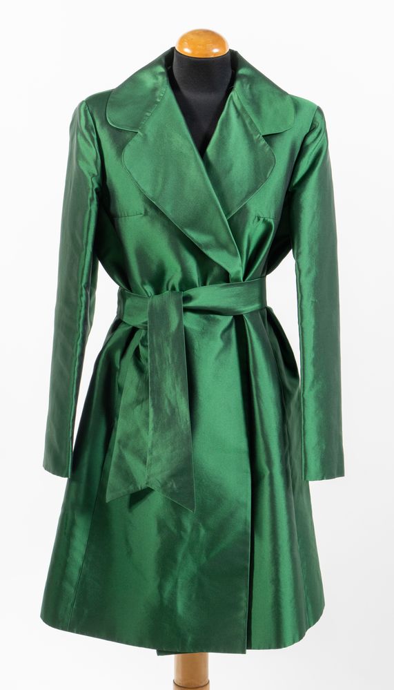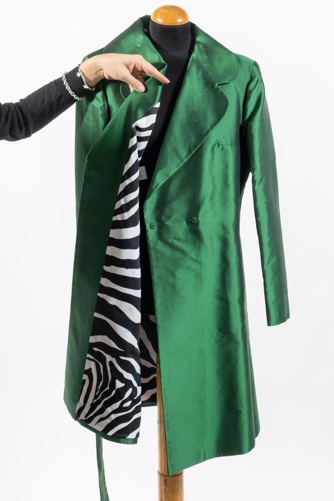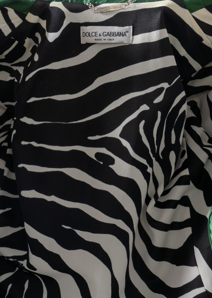 DOLCE & GABBANA Trench a doppiopetto con cintura in misto seta verde. Riporta taglia IT 44. Interno foderato a fantasia animalier bianca e nera. Composizione esterno: 50% seta e 50% poliammidica. Reca etichetta Dolce & Gabbana Made in Italy. (Difetti)