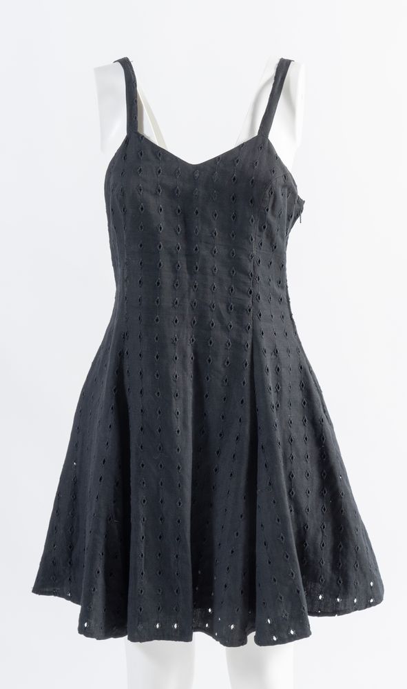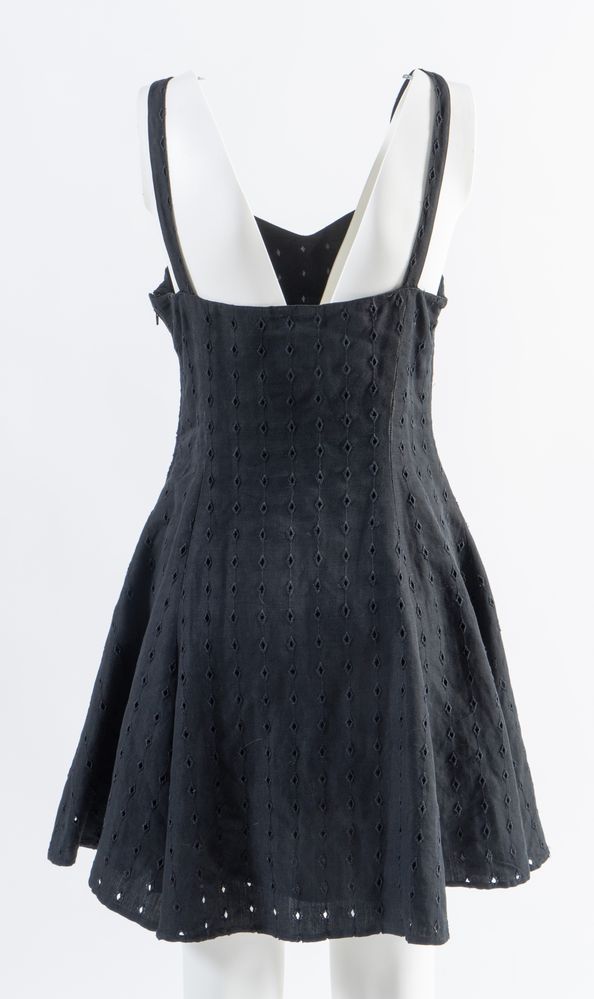 VERSUS by GIANNI VERSACE Abito in sangallo nero. Riporta taglia 42. Composizione: 38% acetato, 27% viscosa, 21% lino e 14% seta. Reca etichetta Versus Gianni Versace Made in Italy.