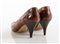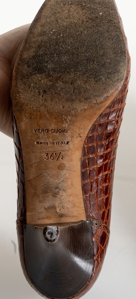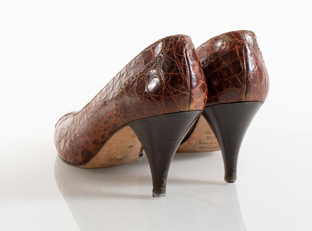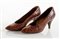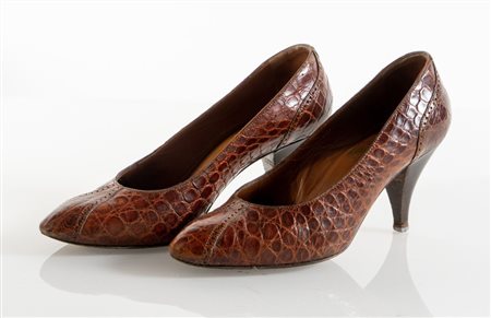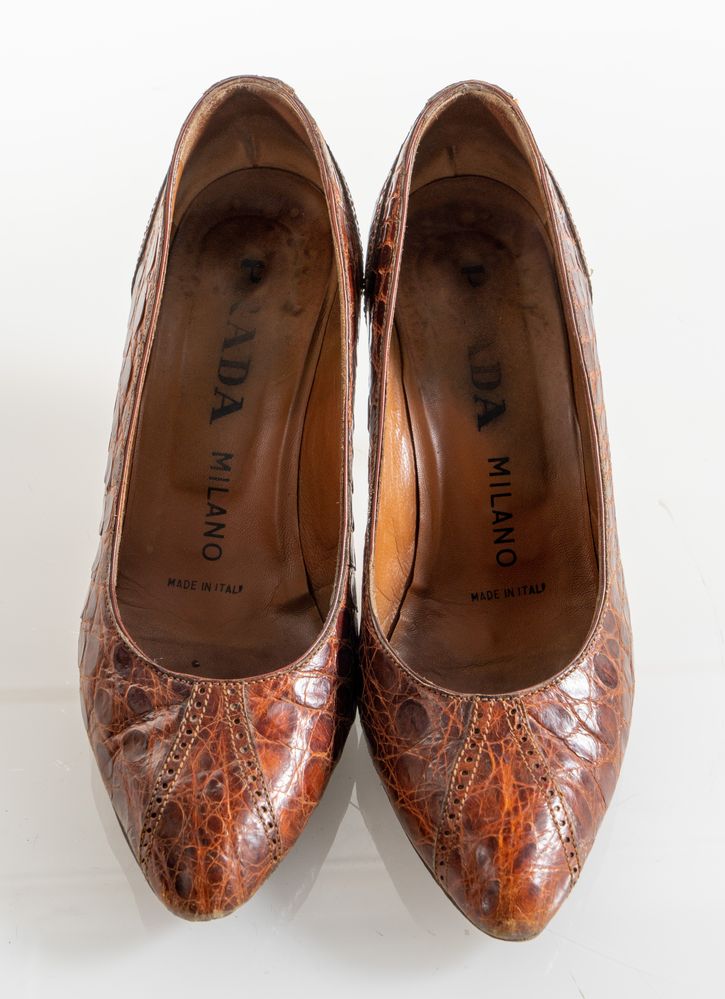 PRADA Scarpe modello décolleté in pelle stampata coccodrillo sui toni del marrone. Riportano taglia 36.5. Altezza tacco: cm 7,5. Ciascuna reca marchi Prada Milano Made in Italy Vero cuoio. (Difetti)