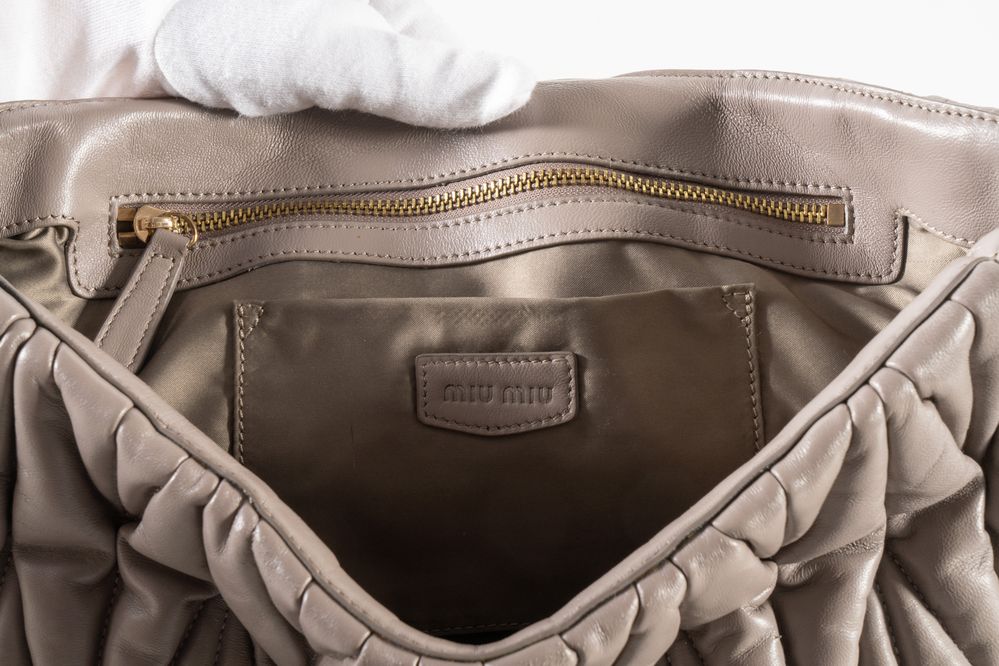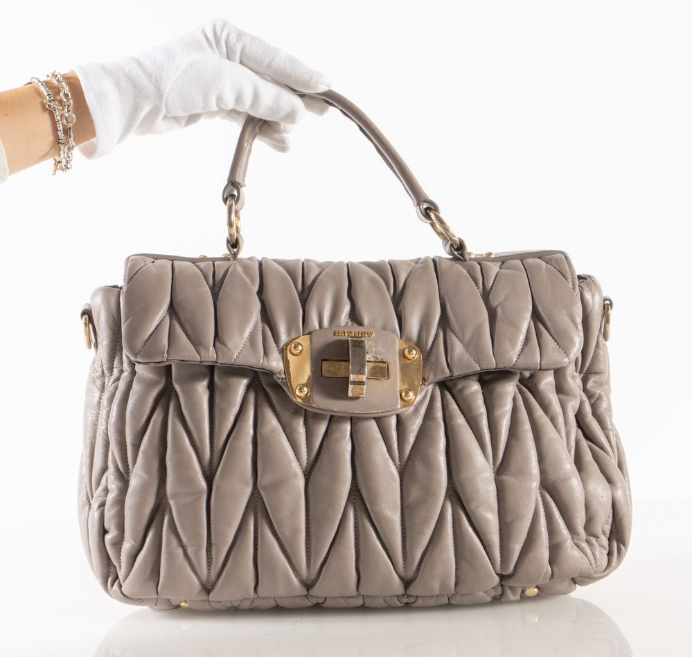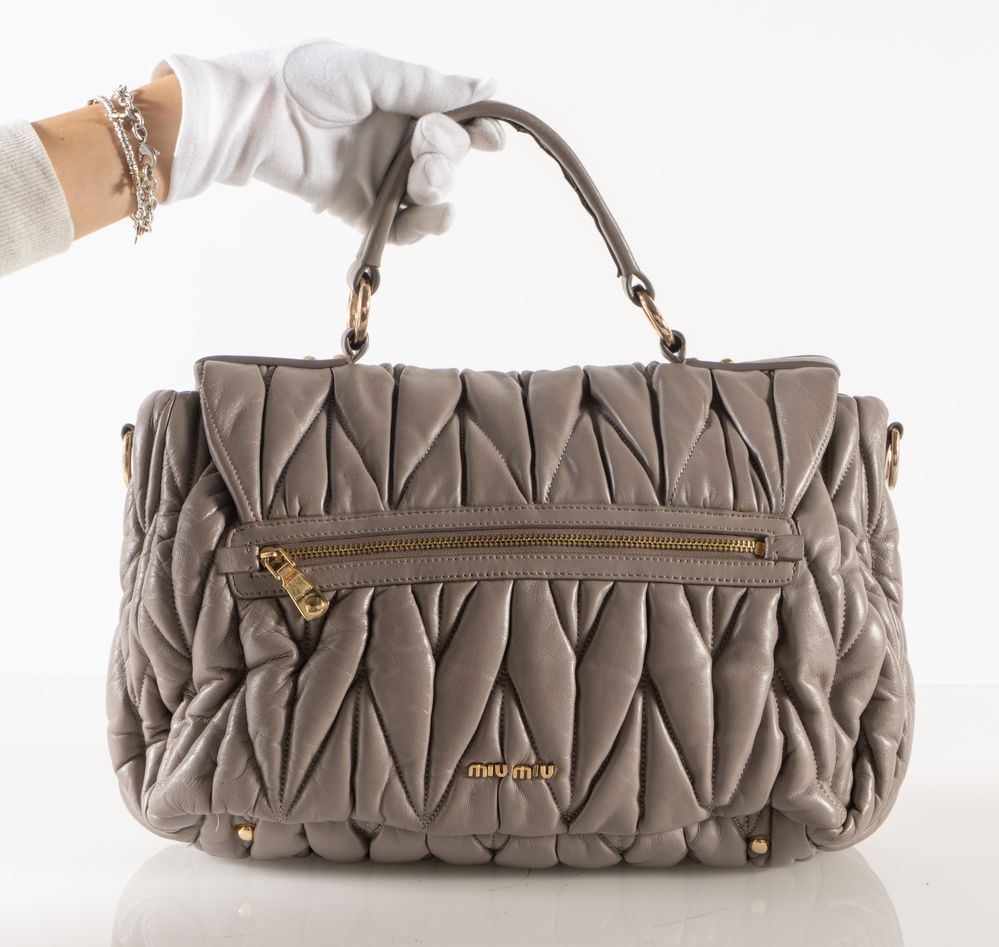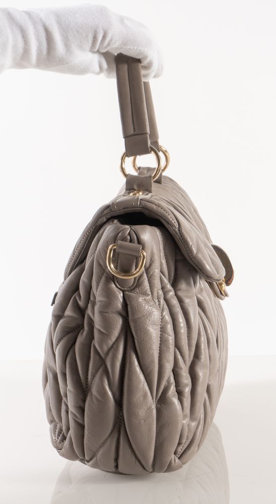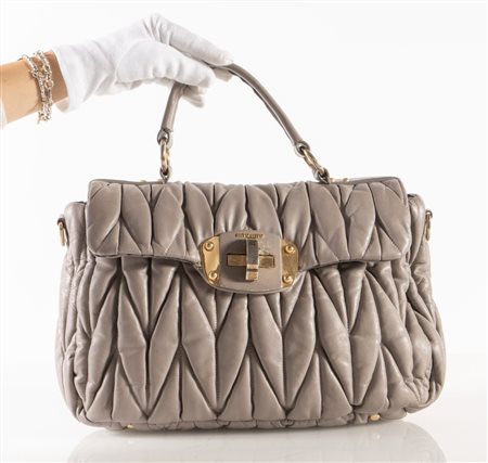MIU MIU Borsa a mano in pelle grigia con lavorazione matellasse e dettagli in metallo dorato. Cm 23x37x14. Altezza con manico: cm 38. Reca marchio ed etichetta Miu Miu. (Difetti e mancanze)