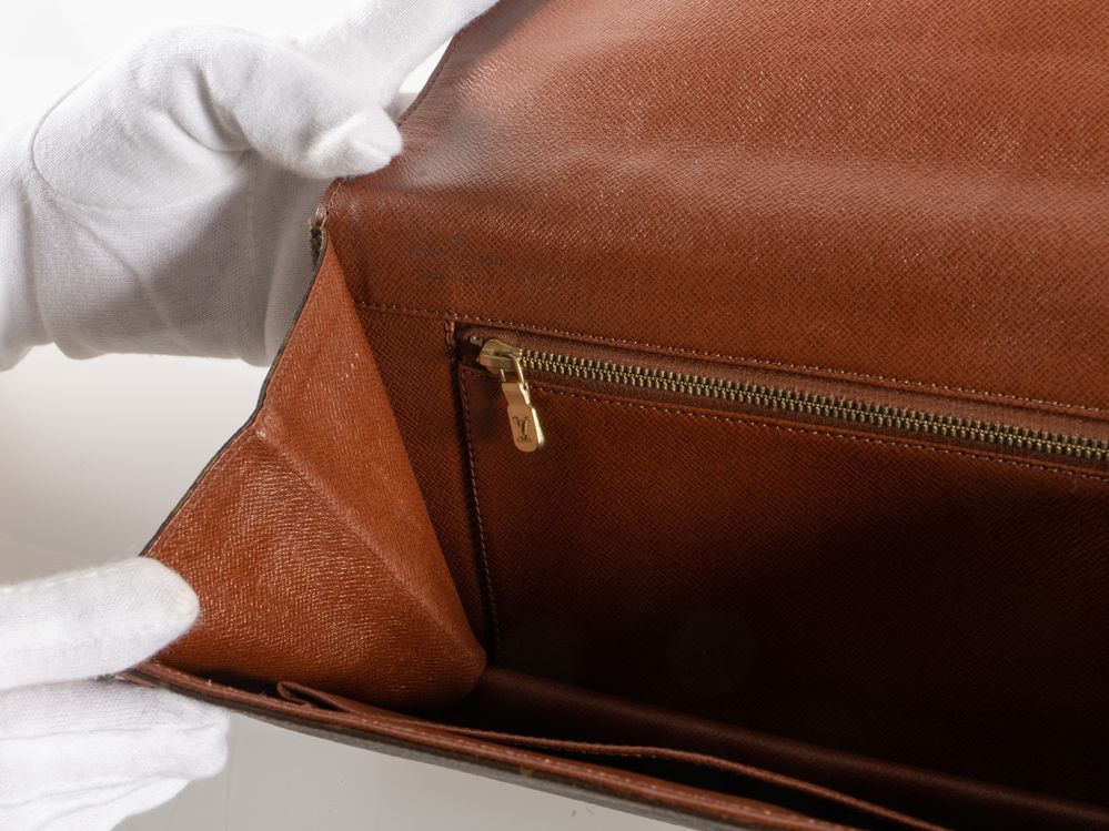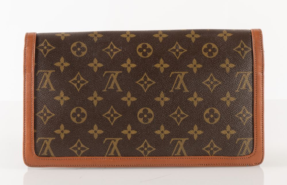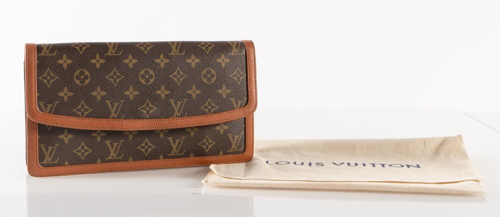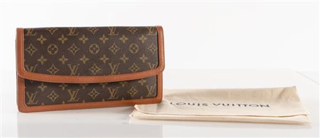 LOUIS VUITTON Pochette modello Dame in tela monogram con dettagli in pelle di vitello marrone. Internamente foderata in pelle di vitello marrone. Cm 16,5x29,5x2. Reca marchio LV, Louis Vuitton Paris Made in France. (Lievi difetti)