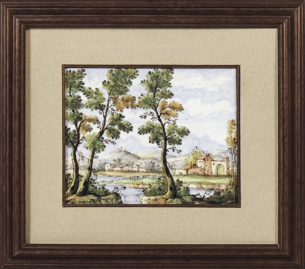 PLACCA IN TERRACOTTA dipinta con paesaggio fluviale, firmata e datata 1963, in cornice cm 20x25