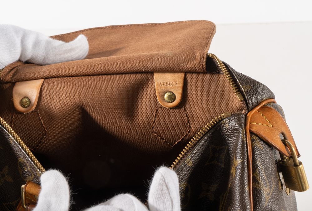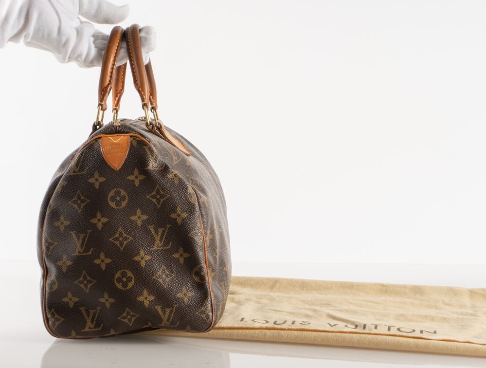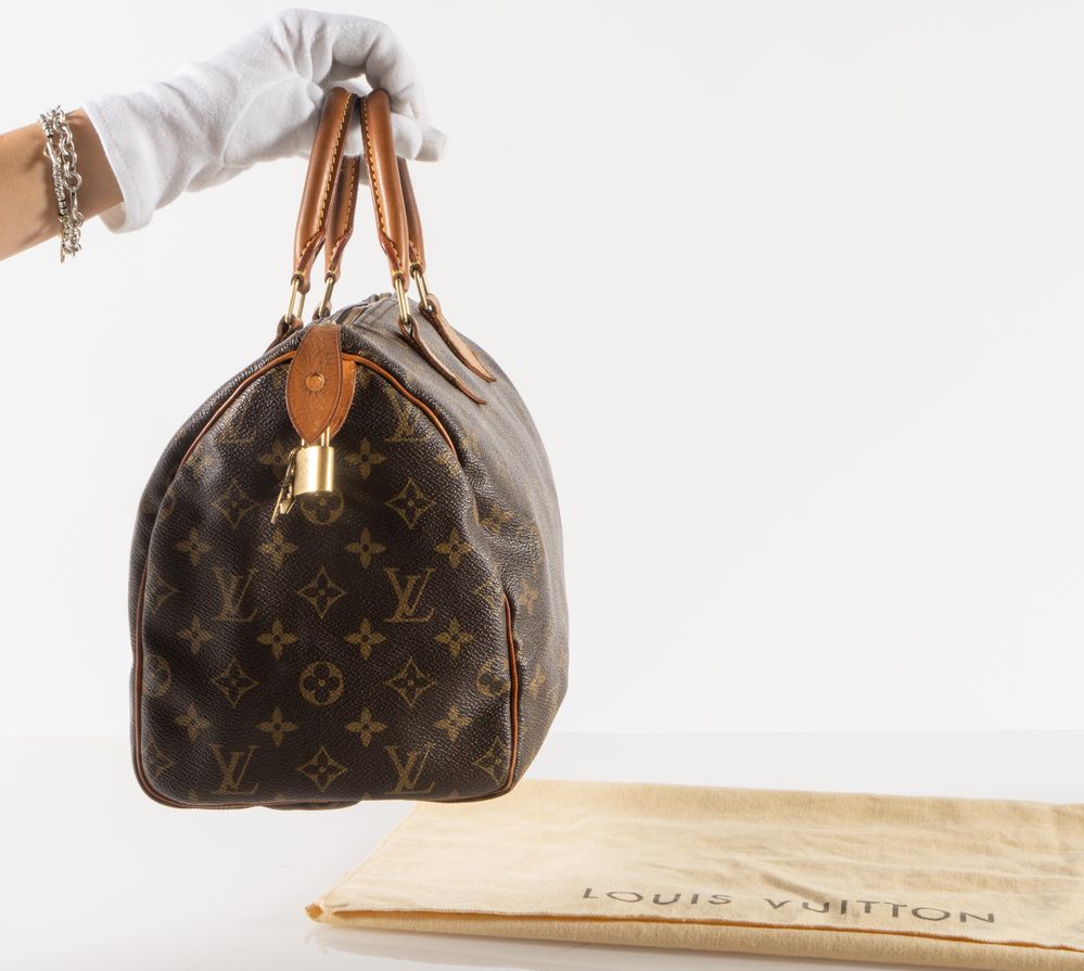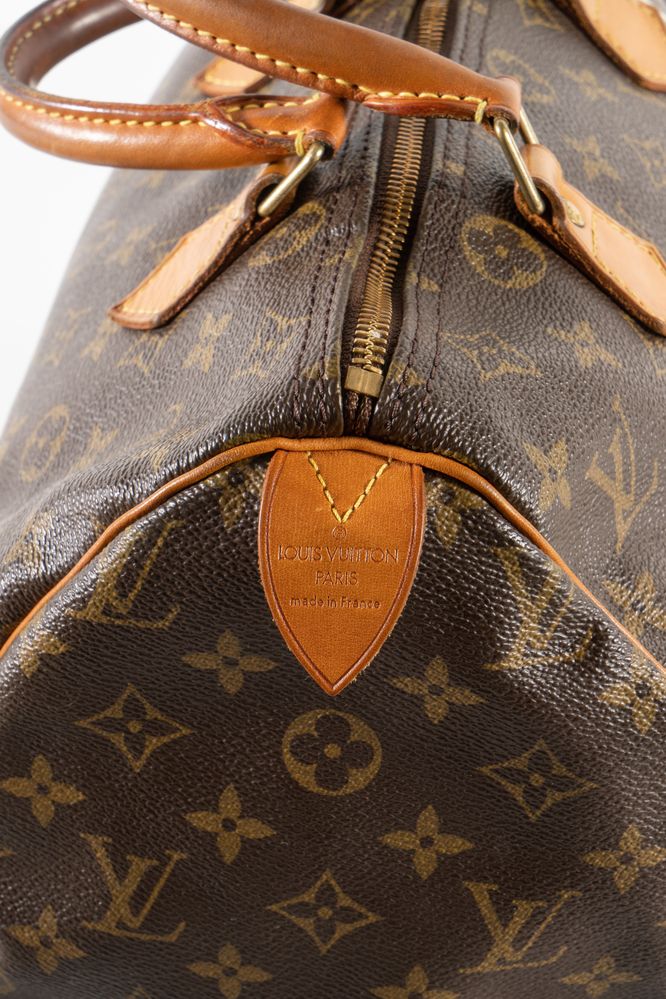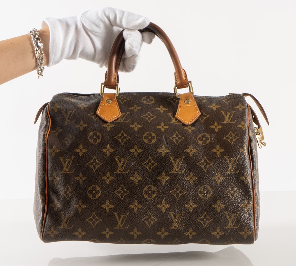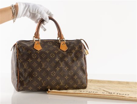 LOUIS VUITTON Borsa a bauletto modello Speedy 30 in tela monogram con rifiniture in cuoio e dettagli in metallo dorato. Cm 26x31x18. Altezza con manici: cm 32. Interno foderato in tela con una tasca porta oggetti. Reca marchi LV, Louis Vuitton, Louis Vuitton Paris Made in France e codice di riferimento prodotto. Corredato di lucchetto, chiavi e dustbag originali. (Difetti)