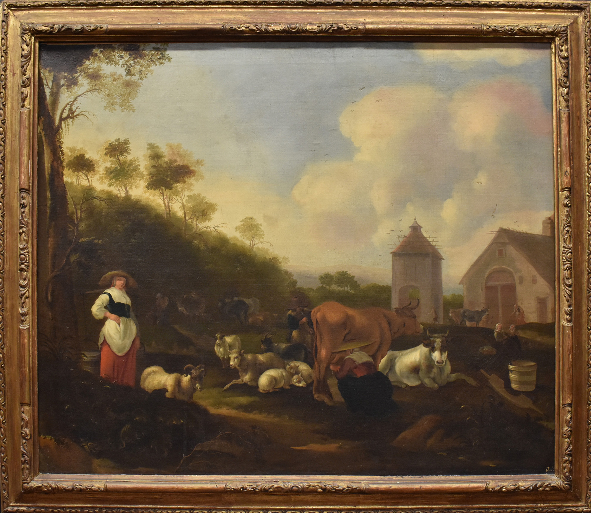 olio su tela 'paesaggio con contadini e armenti' scuola fiamminga sec.XVIII