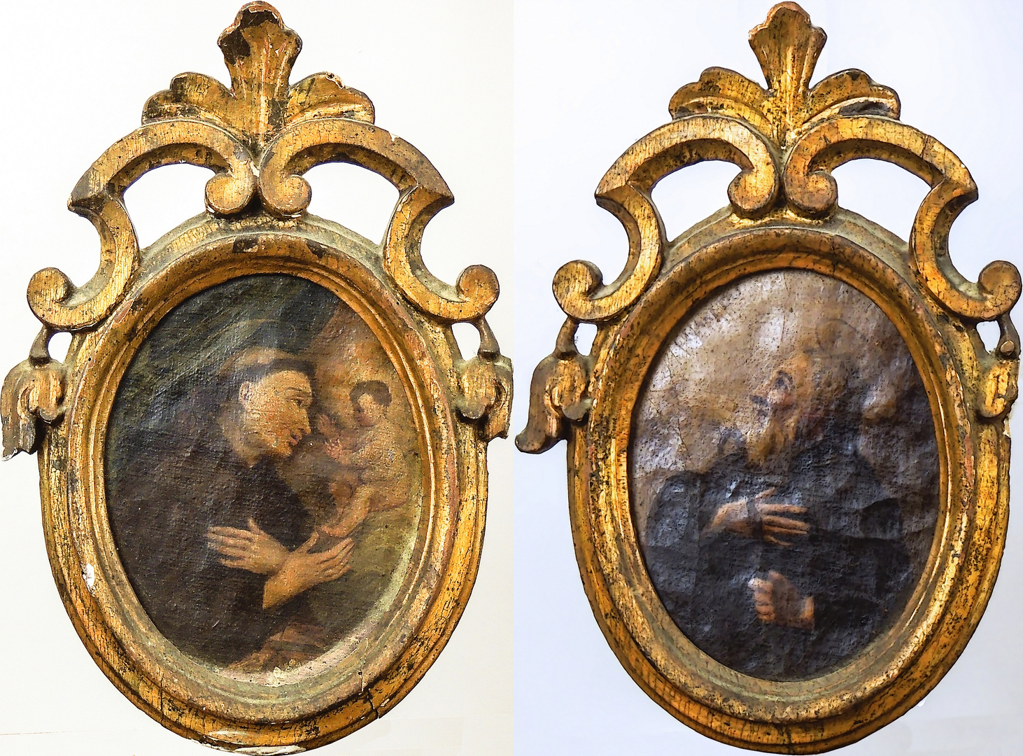 SCUOLA EMILIANA DELLA FINE DEL XVII SECOLO San Francesco e San Francesco di Paola coppia di dipinti ad olio su tela ovale, in cornici dorate cm 16x12