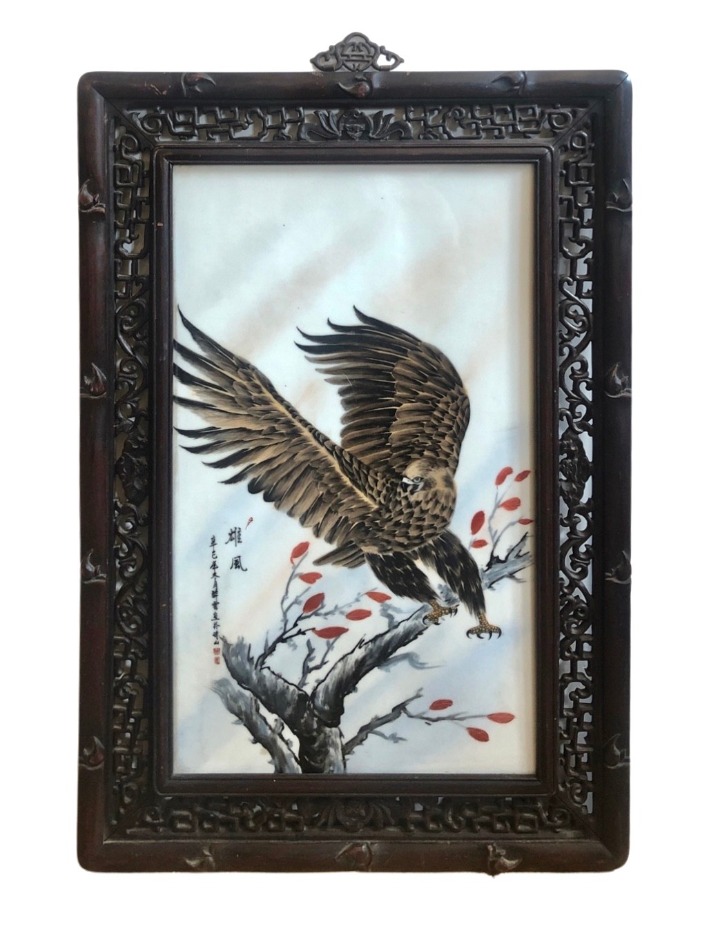 Cina placca in porcellana dipinta con aquila con cornice traforata