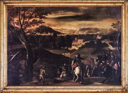 SCUOLA LOMBARDA DEL XVIII SECOLO Paesaggio con cavalieri e castello sullo sfondo olio su tela, in cornice dorata cm 65x98