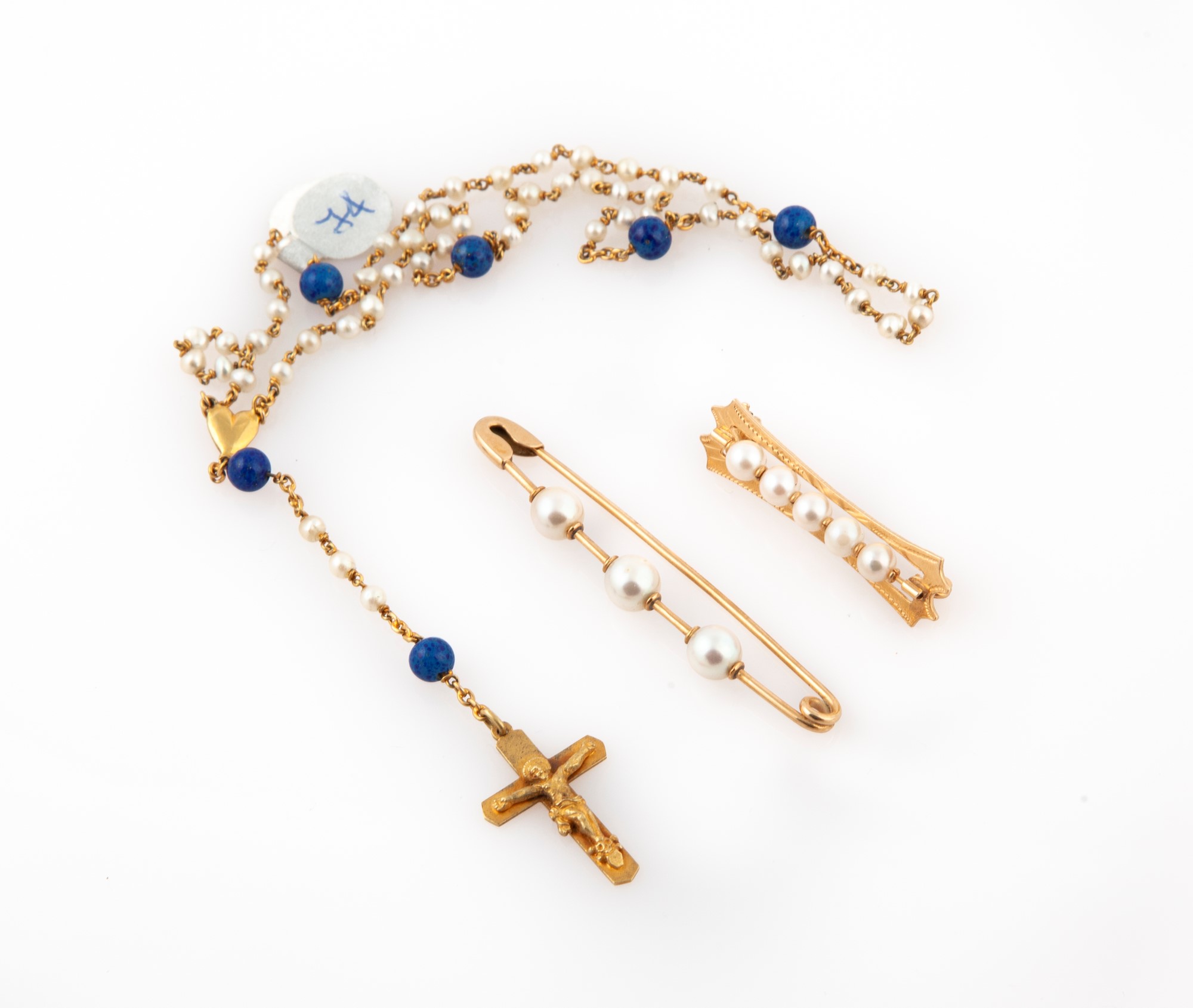 Lotto di due spille da balia e rosario con perle e lapislazzuli