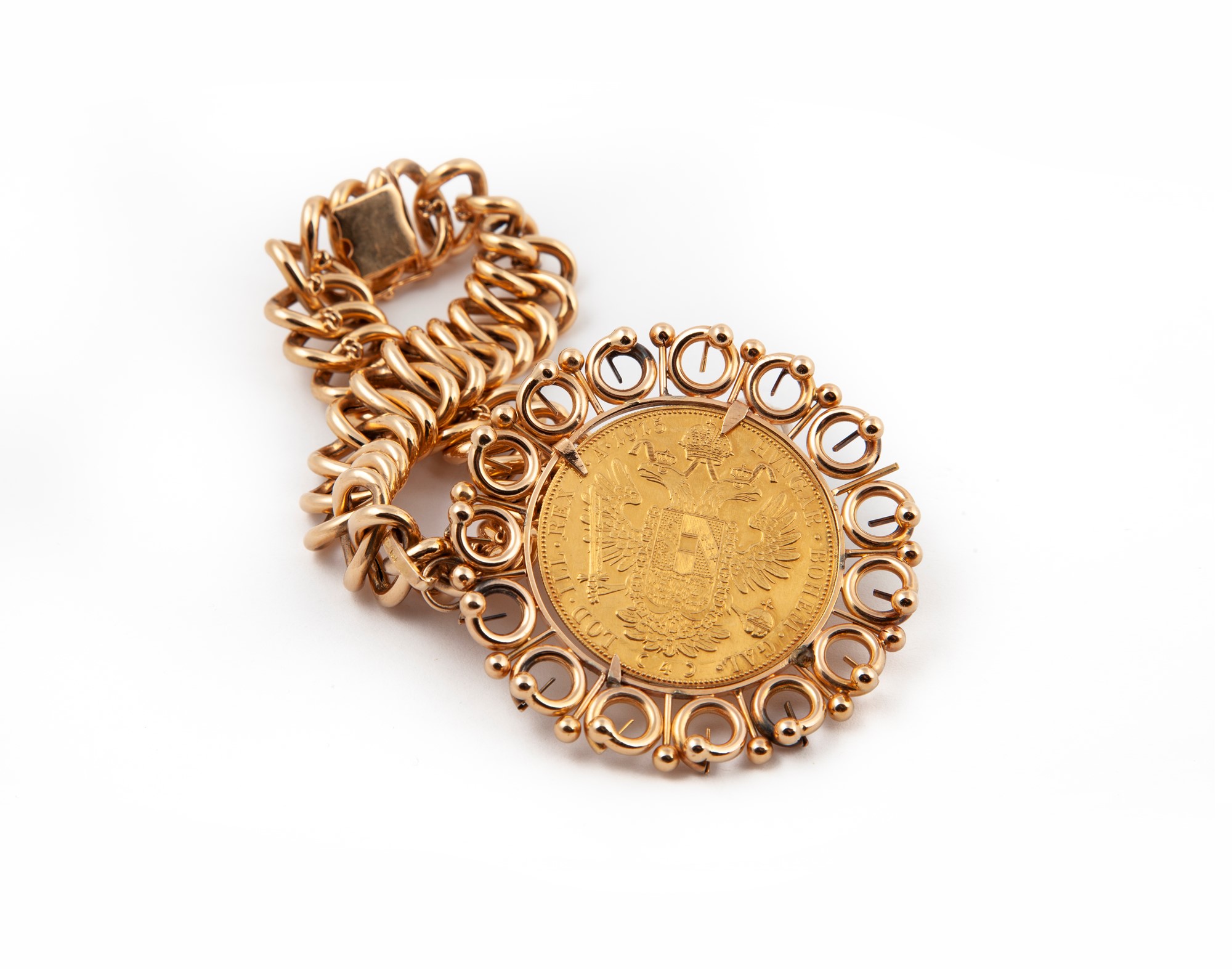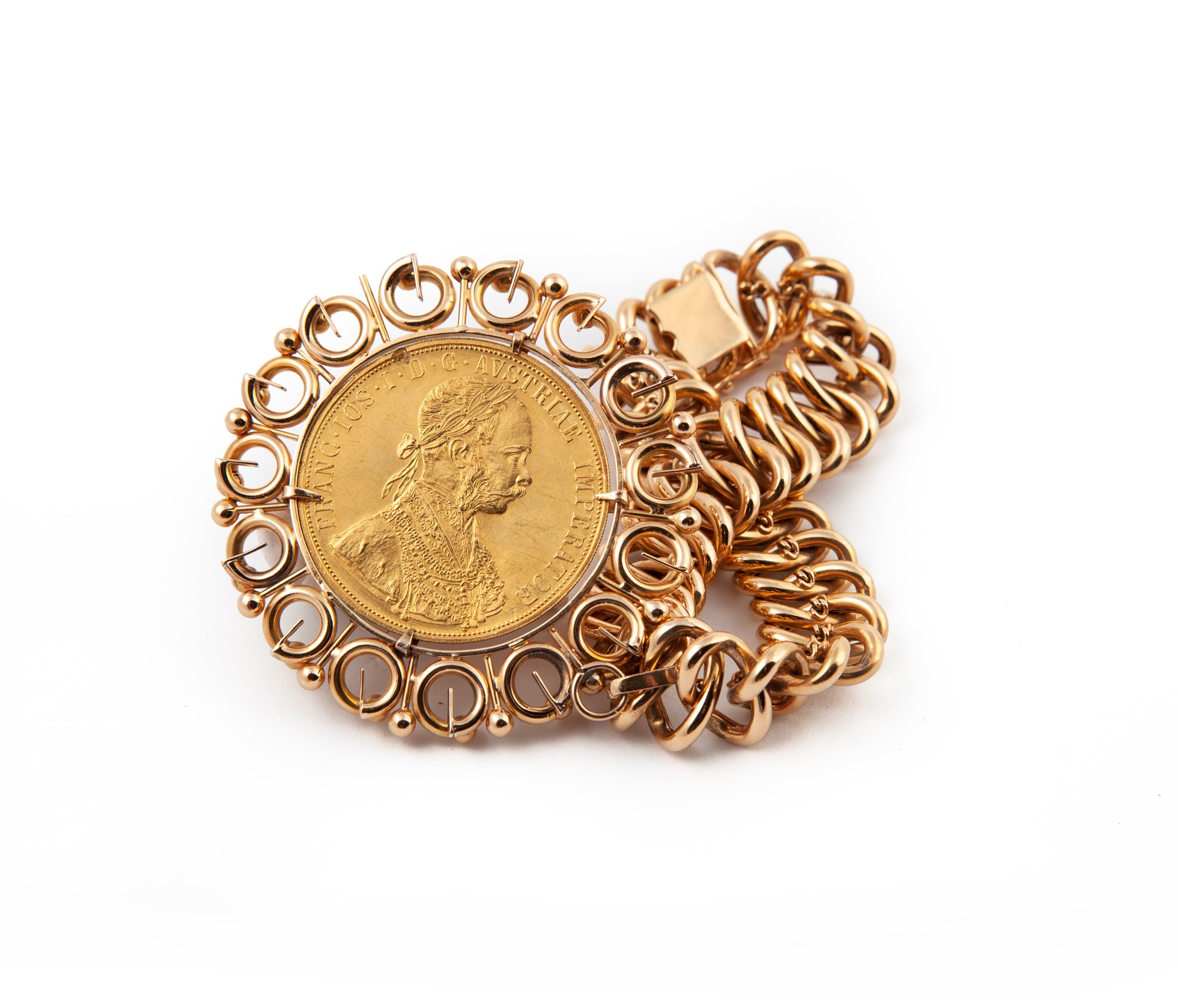 Oro rosa 750/000. Bracciale a catena con maglie ovali piatte trattenenti una moneta da 4 ducati austrica 986/000. Bracciale con punzone del Fascio. Peso complessivo gr. 68,40.