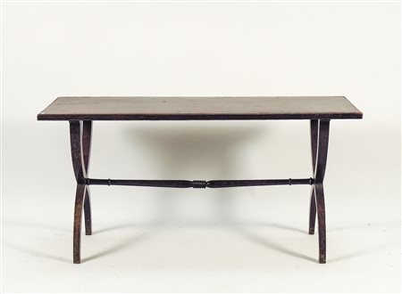 TAVOLINO BASSO DA APPOGGIO IN MOGANO gambe a faldistorio riunite da traversa h cm 54x109x41