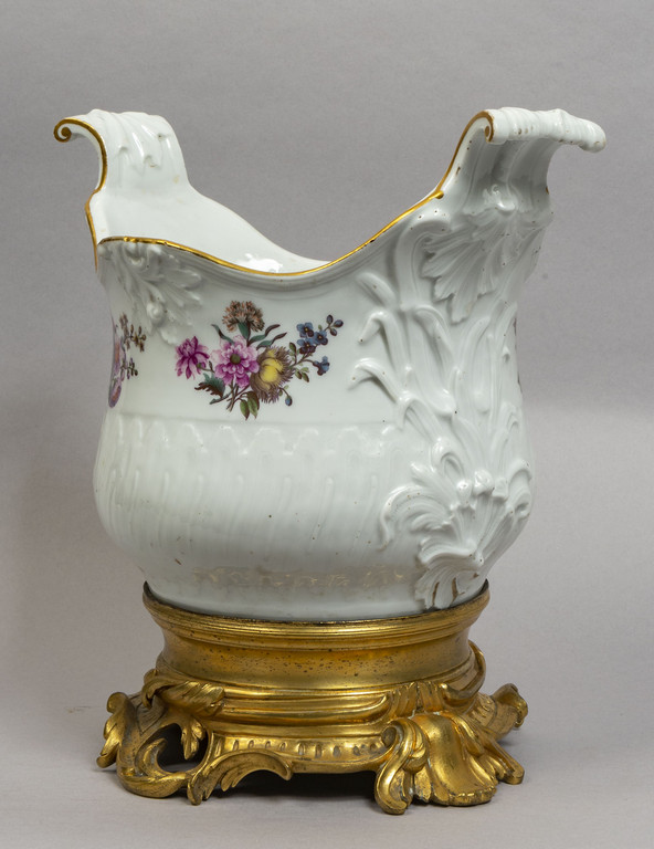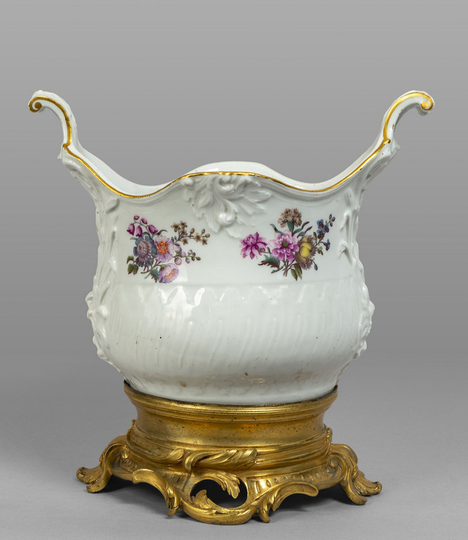 Cachepot in porcellana bianca decorato a fiorellini con base in bronzo dorato sec.XIX