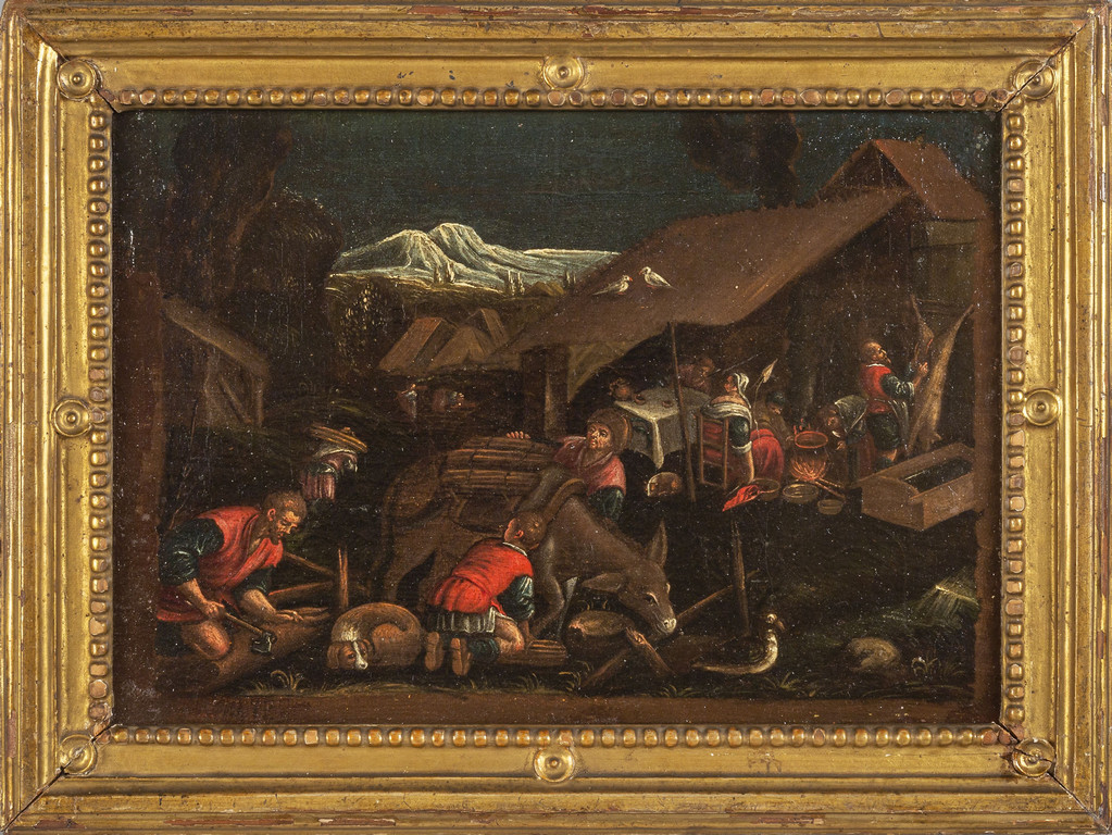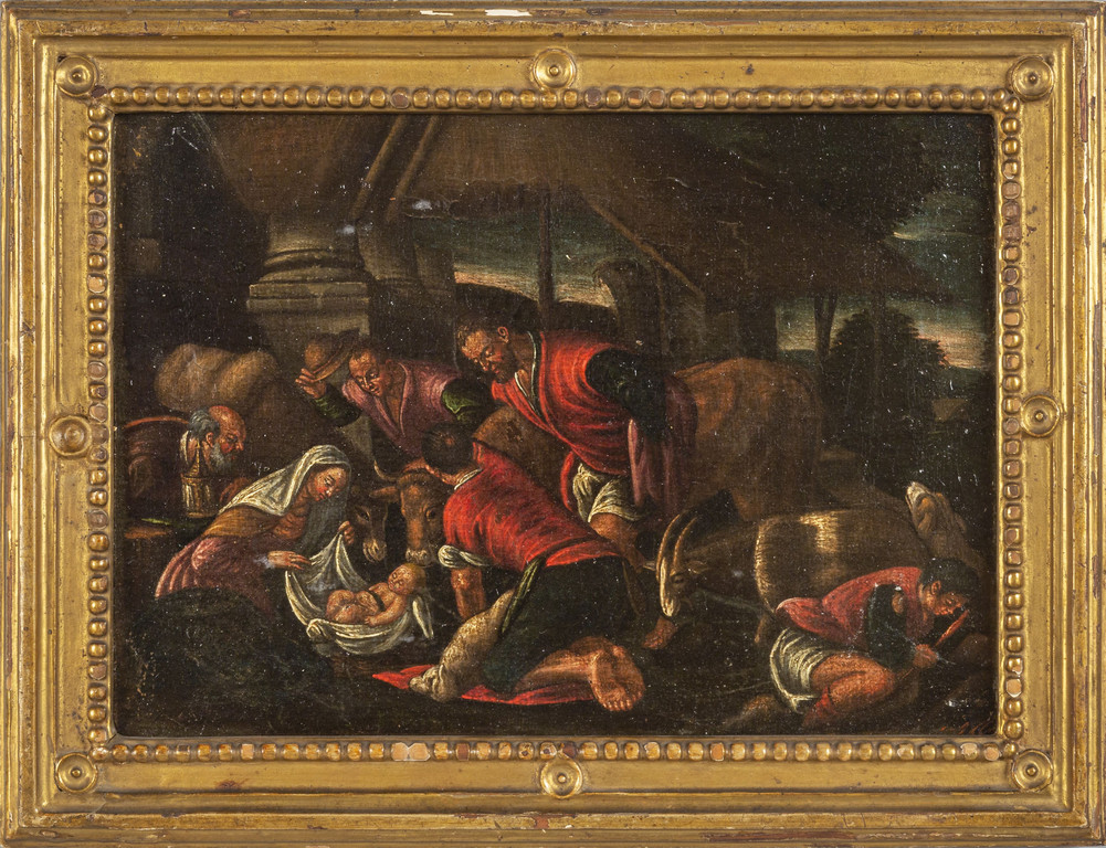 Scuola veneta sec.XVII 'Natività' ed 'I pastori' coppia di olii cornici coeve in legno intagliato e dorato di epoca