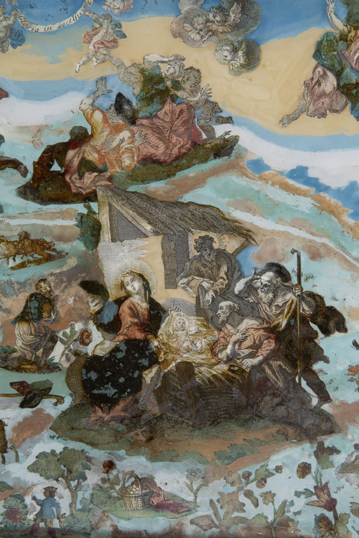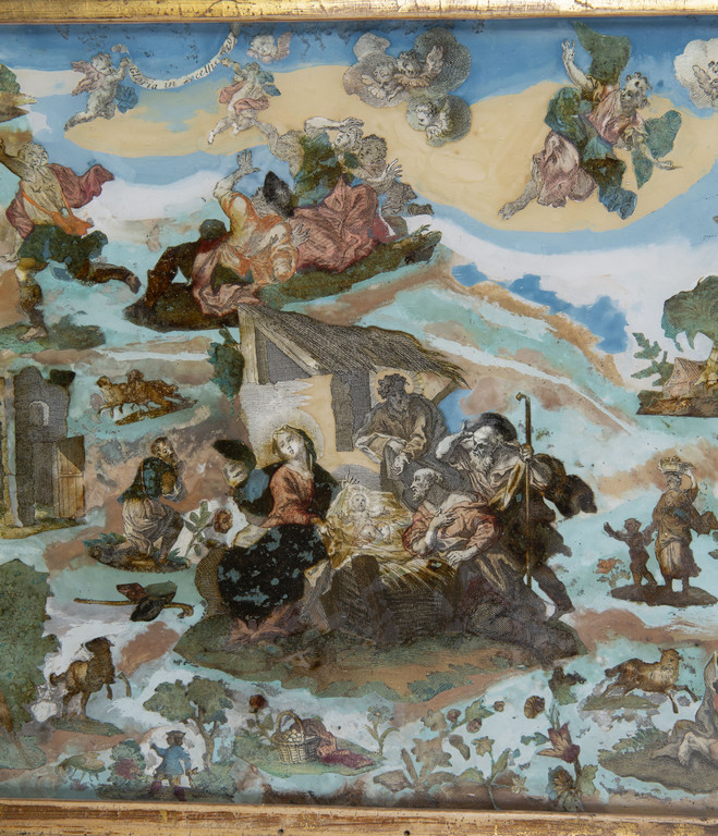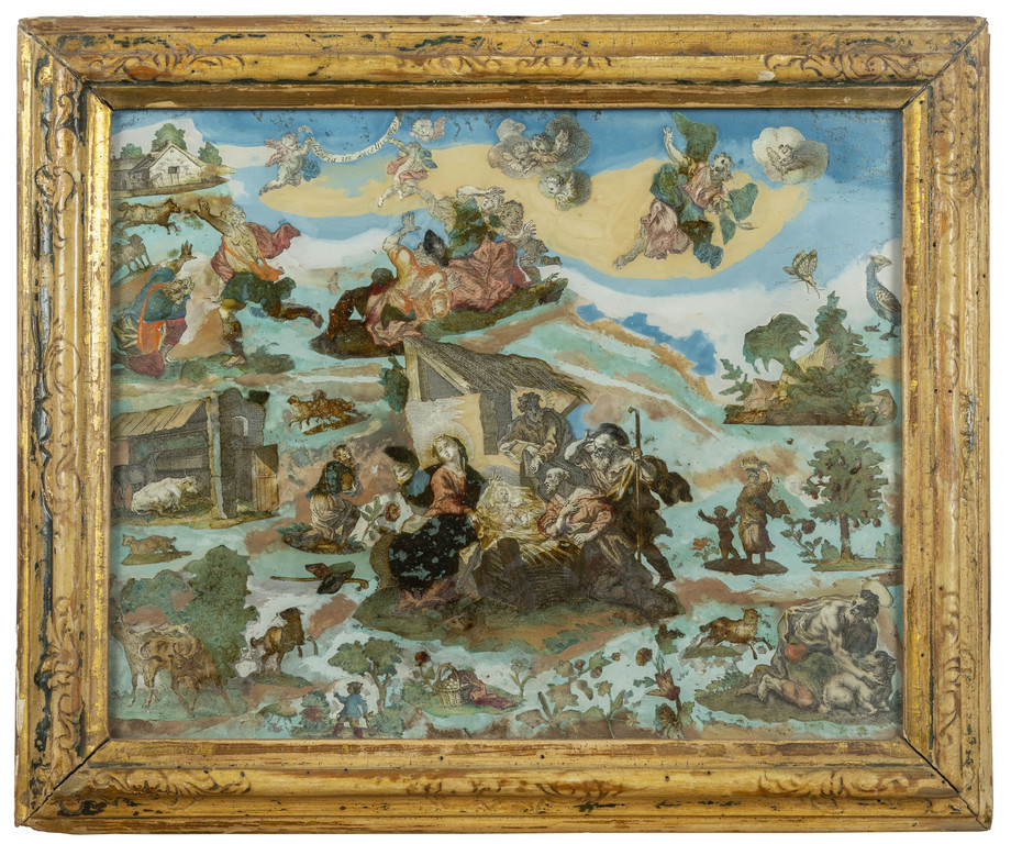 Scuola veneta sec.XVIII 'Sacra Famiglia contornata da figurine e scenette' olio e carta su vetro cornice antica in legno laccato