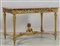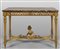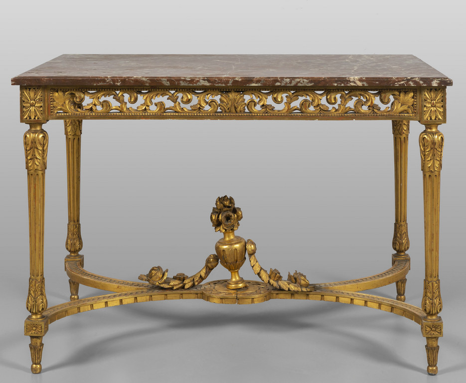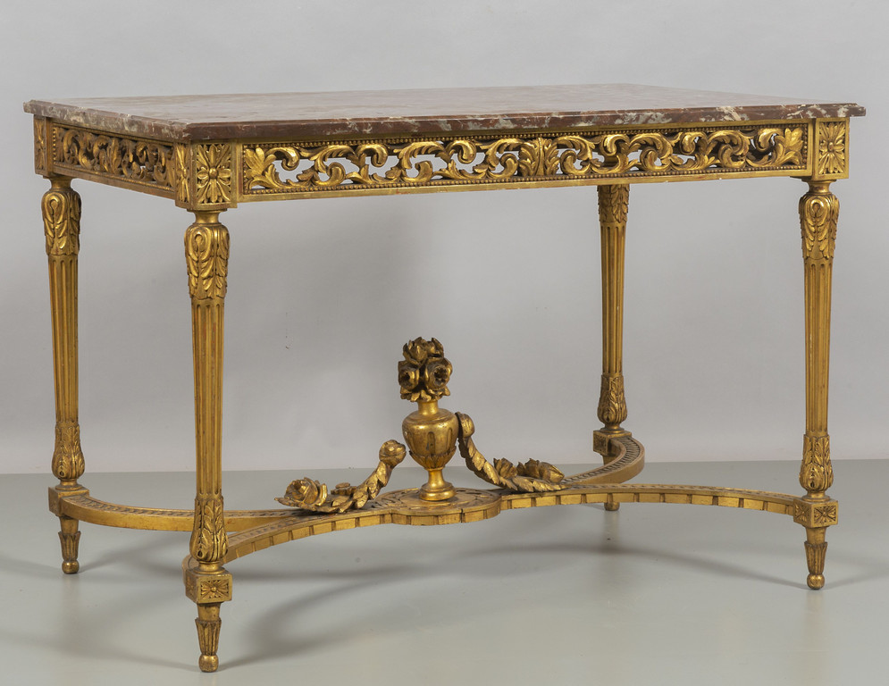 Tavolo da centro in stile Luigi XVI in legno intagliato e dorato gambe raccordate da traversa con al centro un vaso di fiori piano in marmo sec.XX