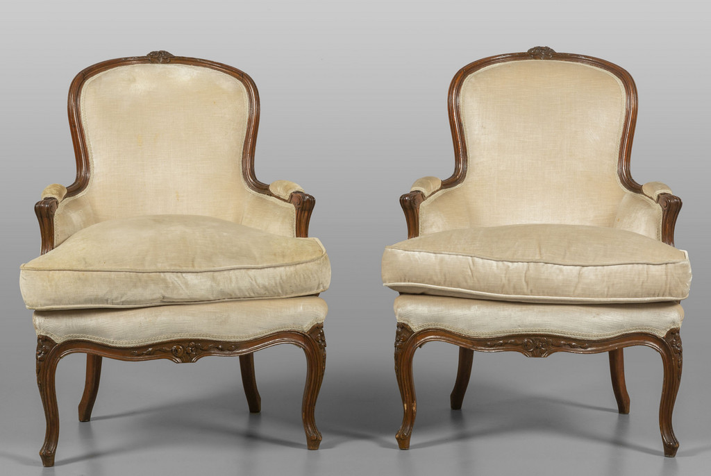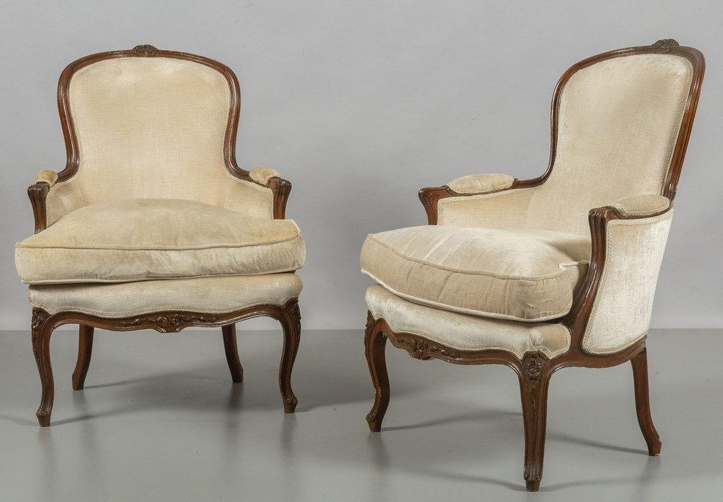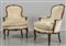 Coppia di bergeres Luigi XV in faggio intagliato sul fronte e sulla sommità della seduta Francia sec.XVIII