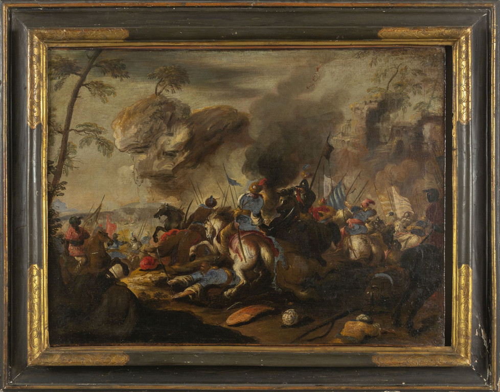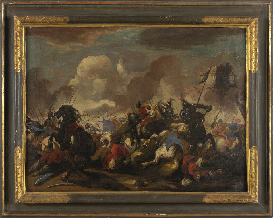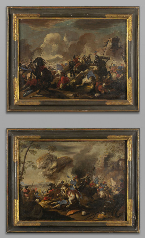 Scuola veneta sec.XVII 'Battaglia tra turchi e cristiani' coppia di olii cornici coeve a sagoma romana in legno ebanizzato ed oro