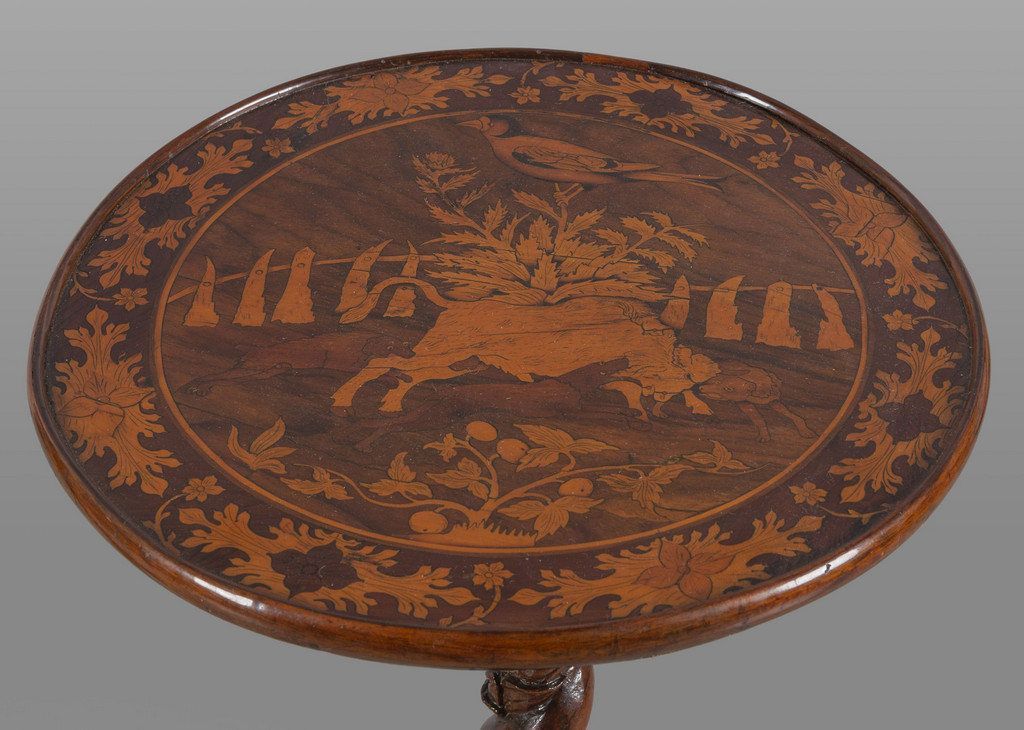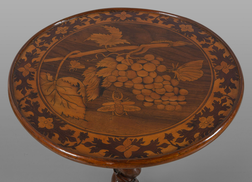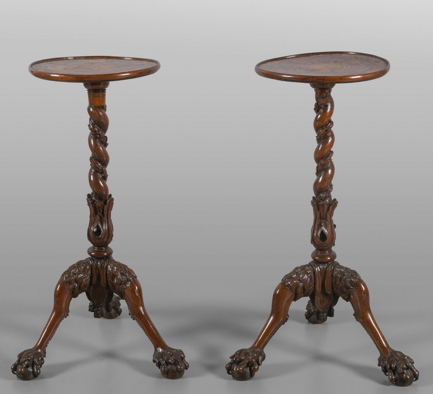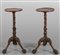 Coppia di trespoli in legno lastronato parte superiore finemente intarsiata a motivi di frutta Inghilterra sec.XVIII