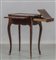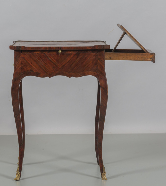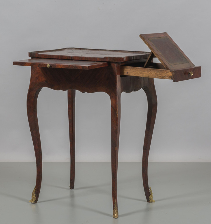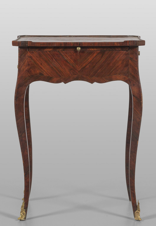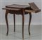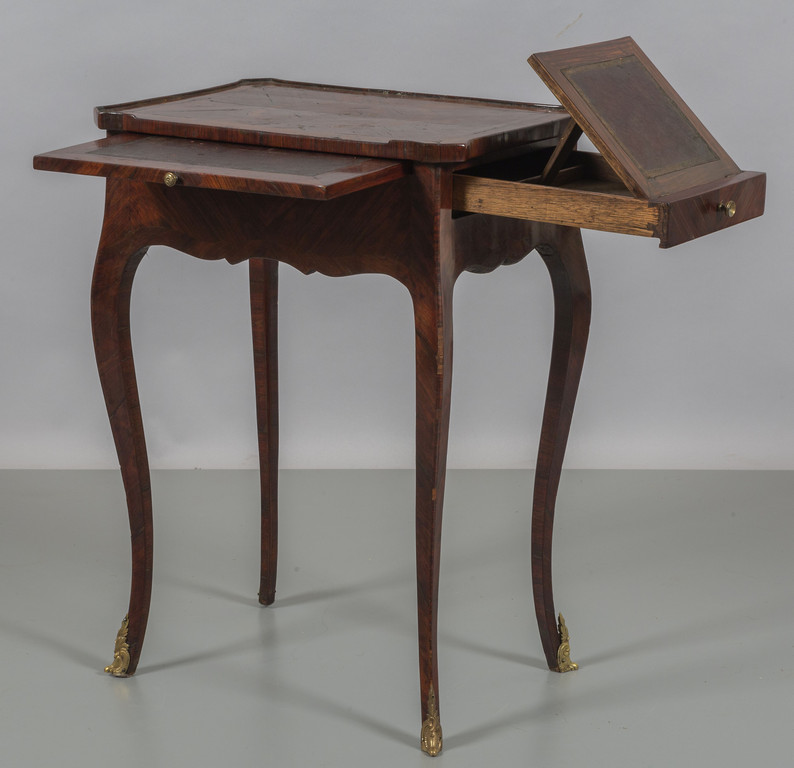 Tavolino da centro lastronato ed intarsiato in legni pregiati cassetti laterali di cui uno celante un servizio da scrittoio nel fronte pianetto estraibile Francia sec.XVIII