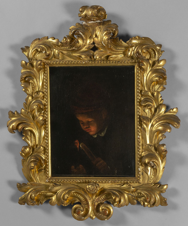 Scuola lombarda sec.XVII 'A lume di candela' olio cornice barocca coeva ridorata