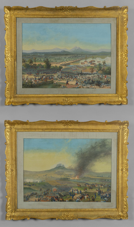'Battaglie' coppia di gouaches sec.XIX cornici coeve in legno intagliato e dorato