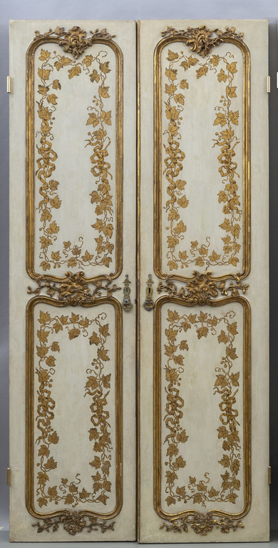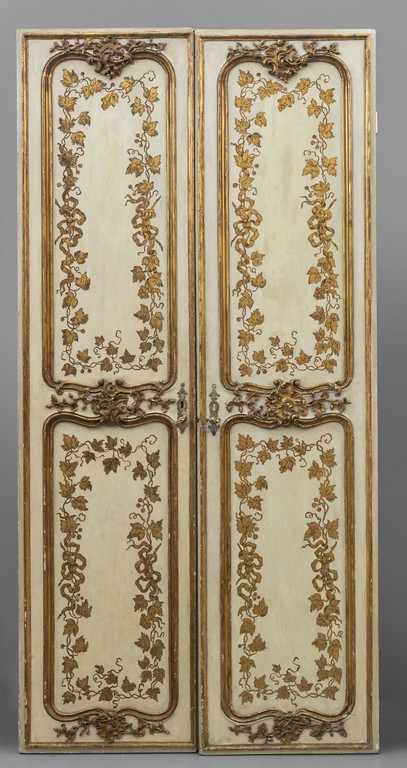 Due ante a doppia faccia in legno intagliato laccato e dorato con foglie e nastri Roma sec.XVIII