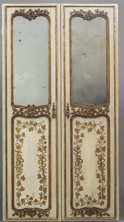 Due ante in legno intagliato laccato e dorato con foglie e nastri parte superiore con specchio Roma sec.XVIII