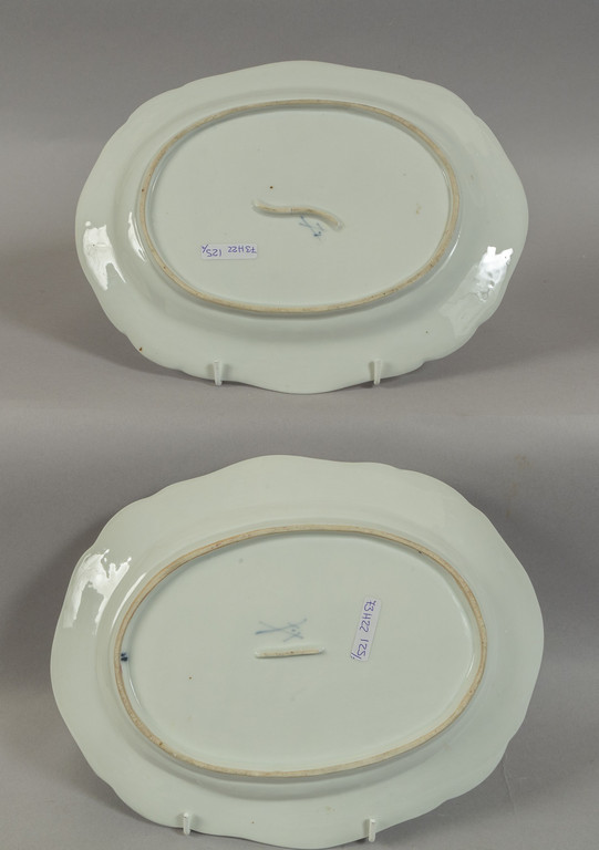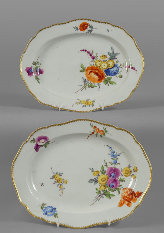 Coppia di vassoi in porcellana di Meissen decorati in policromia a fiori su fondo bianco sec.XIX