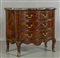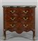 Piccolo comò Luigi XIV a tre cassetti movimentato sul fronte e sui fianchi montanti scantonati ricca decorazione ad intarsi con legni pregiati con il motivo del cuore piano in marmo verde Spagna I metà sec.XVIII