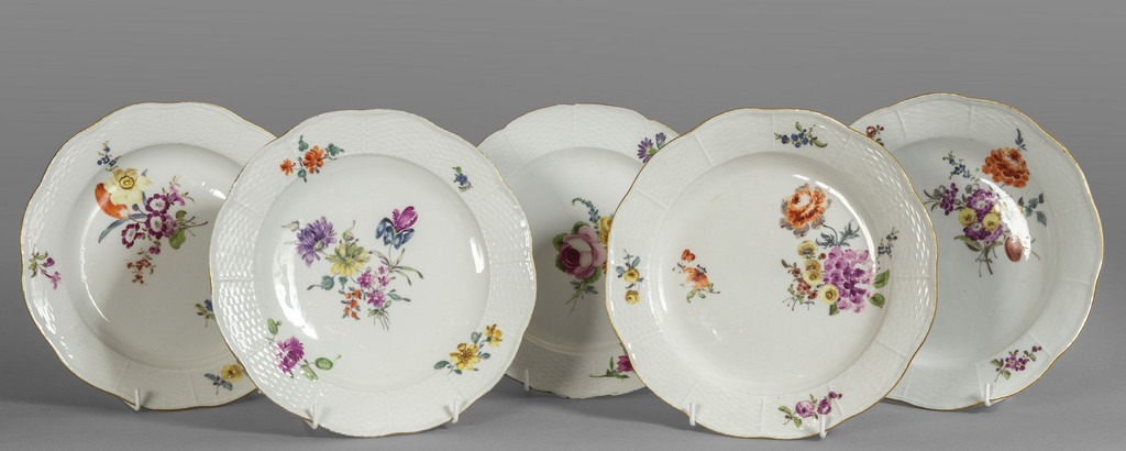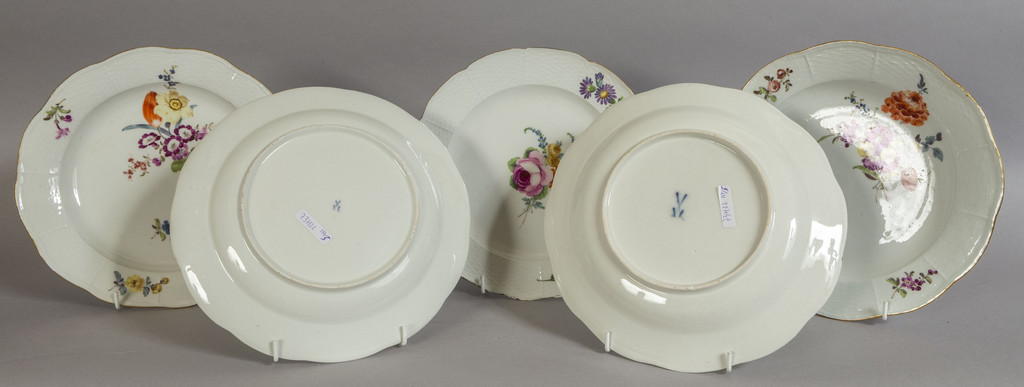 Cinque piatti in porcellana di Meissen decorati in policromia a fiori