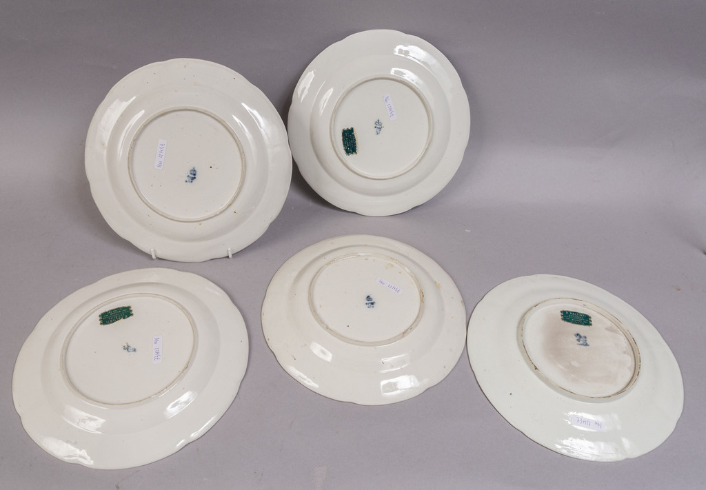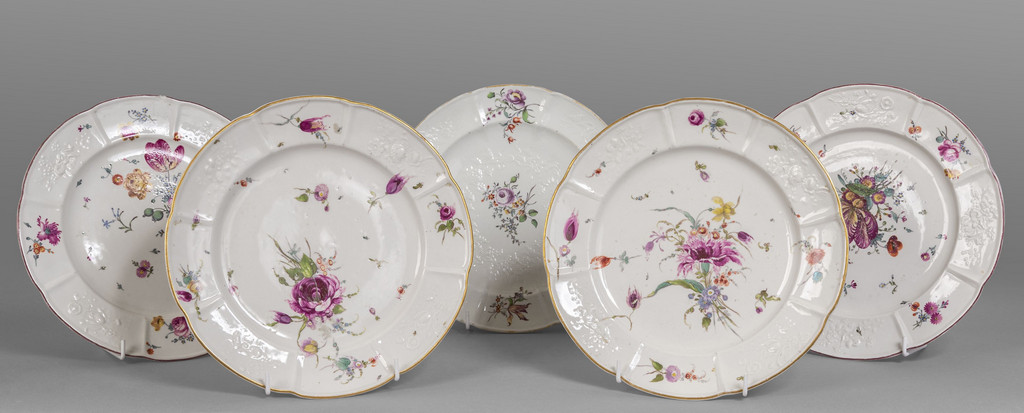 Cinque piatti diversi in porcellana Frankental decorati in policromia a fiori con parti in rilievo sec.XVIII/XIX
