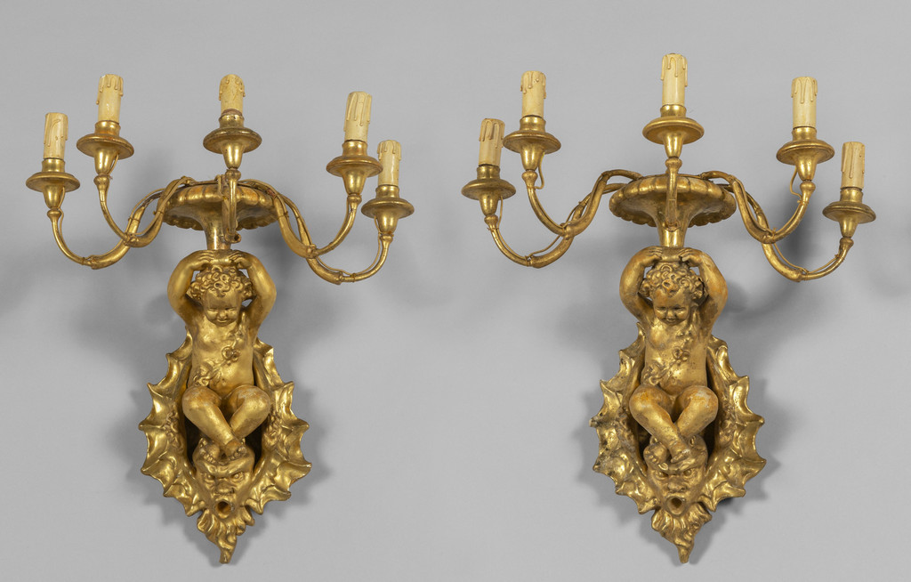 Coppia di apliques in legno finemente intagliato e dorato un putto poggiante su una base con mascherone sorregge un cesto a cinque luci Roma sec.XVIII