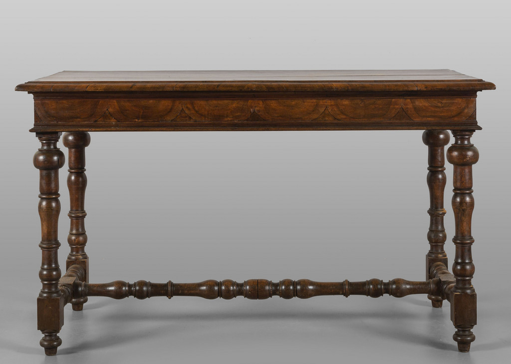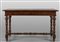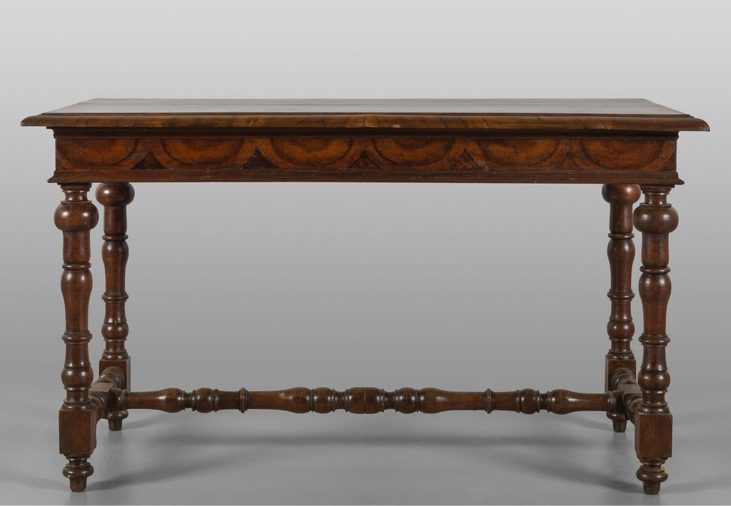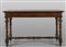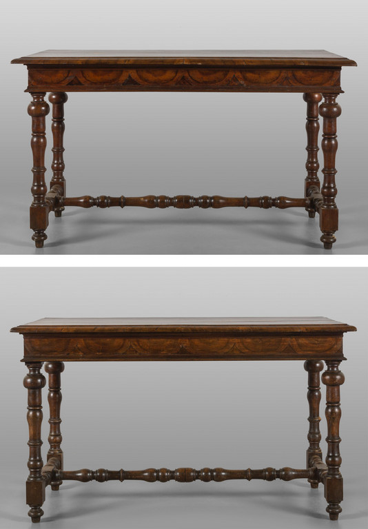 Coppia di tavoli da centro in noce gambe a rocchetto raccordate da traverse fascia lastronata in radica bordi del piano in legno di testa Toscana sec.XVII