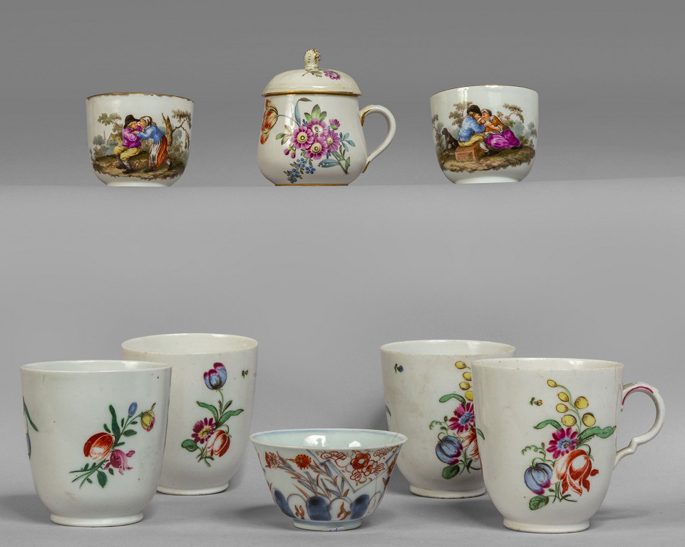 Quattro tazzine in porcellana Ginori due Meissen una Cina ed una cremierina Frankental con coperchio rotto
