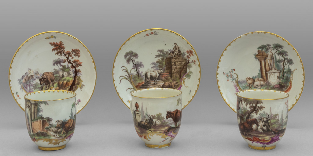 Dieci tazzine con piattino in porcellana di Frankental decorate con personaggi classici ed armenti sec.XVIII