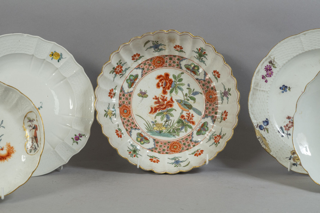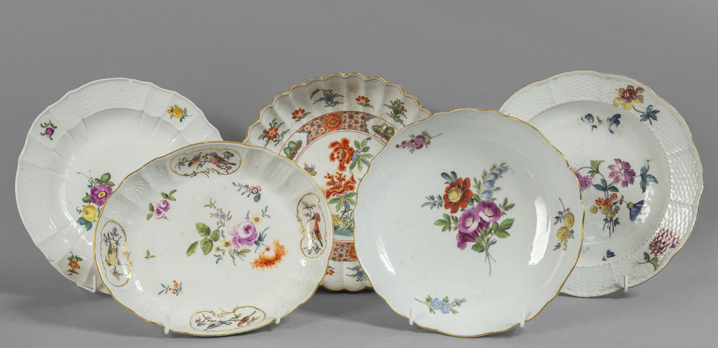 Cinque piatti diversi in porcellana di Meissen decorati in policromia a fiori (sbeccature)
