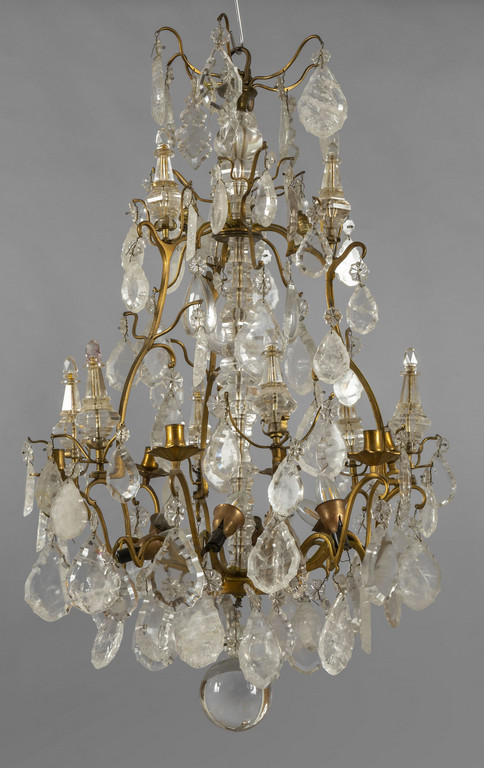 Importante lampadario a sei luci in bronzo dorato ricchissima decorazione in cristallo di rocca