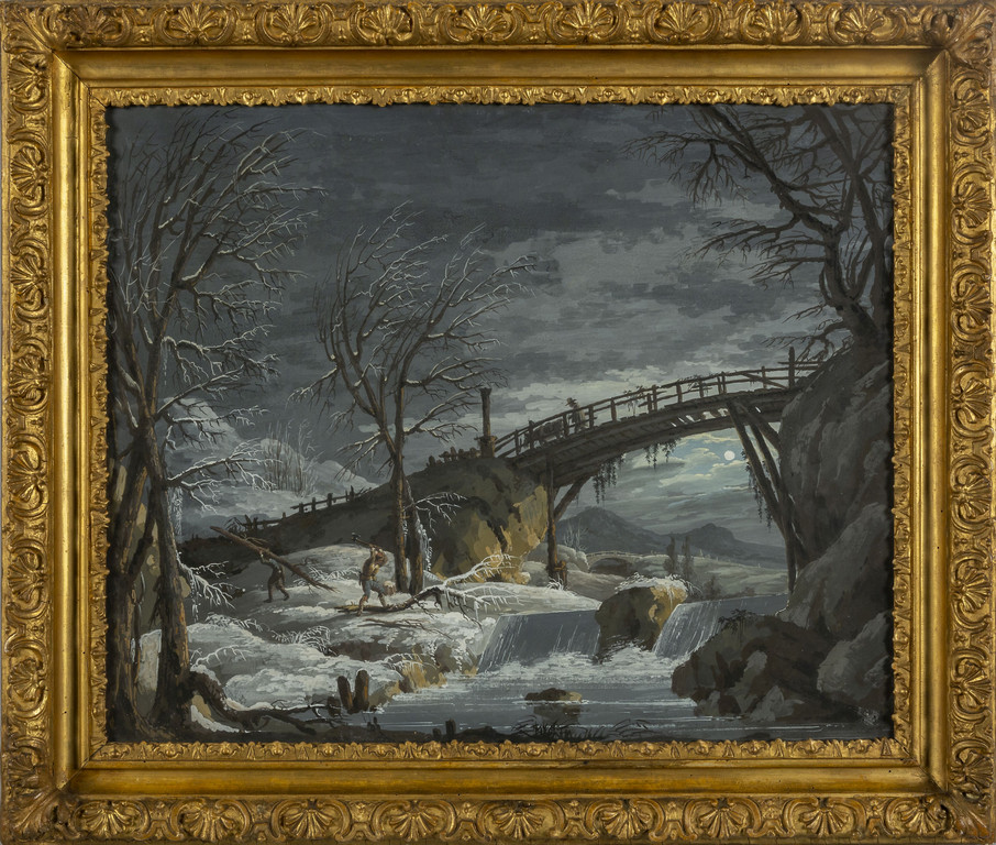 Scuola marchigiana fine sec.XVIII 'Paesaggio innevato con taglialegna' tempera su carta cornice coeva in legno intagliato e dorato