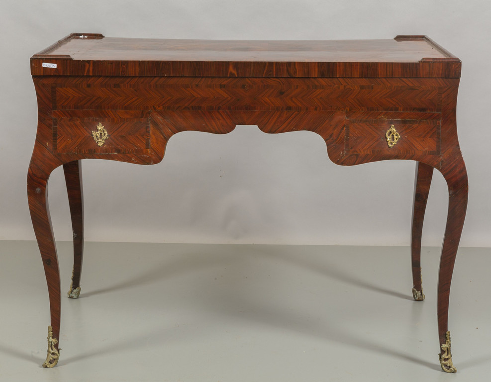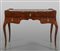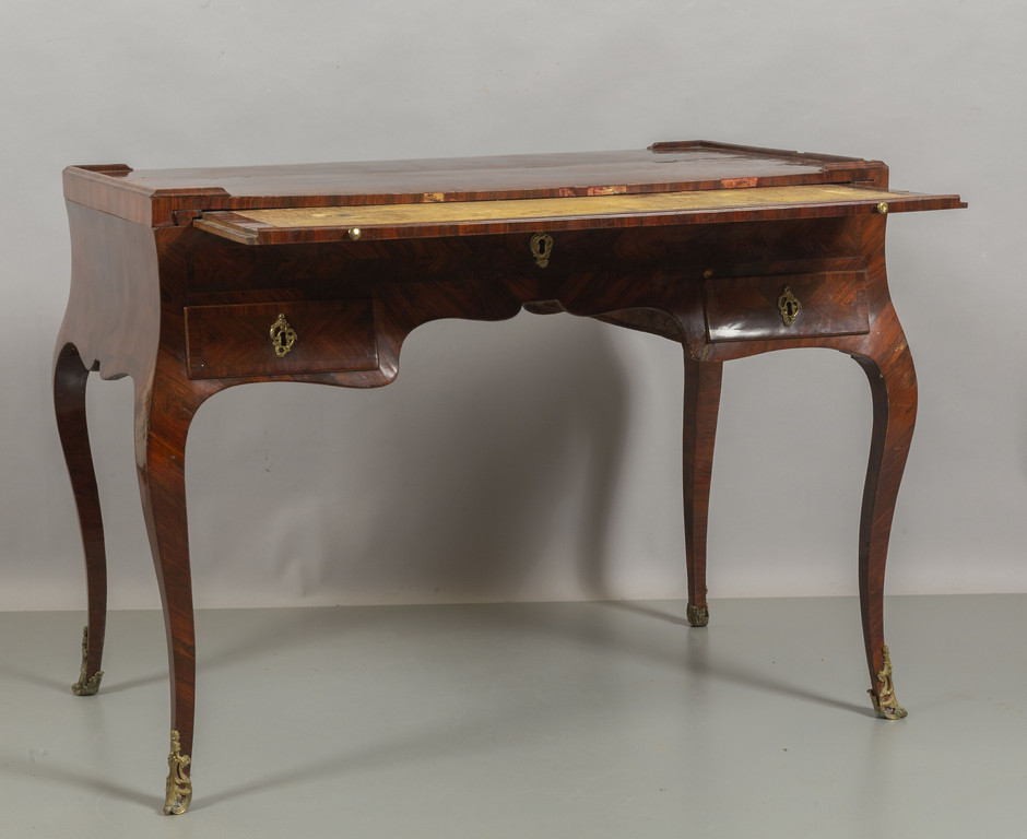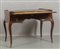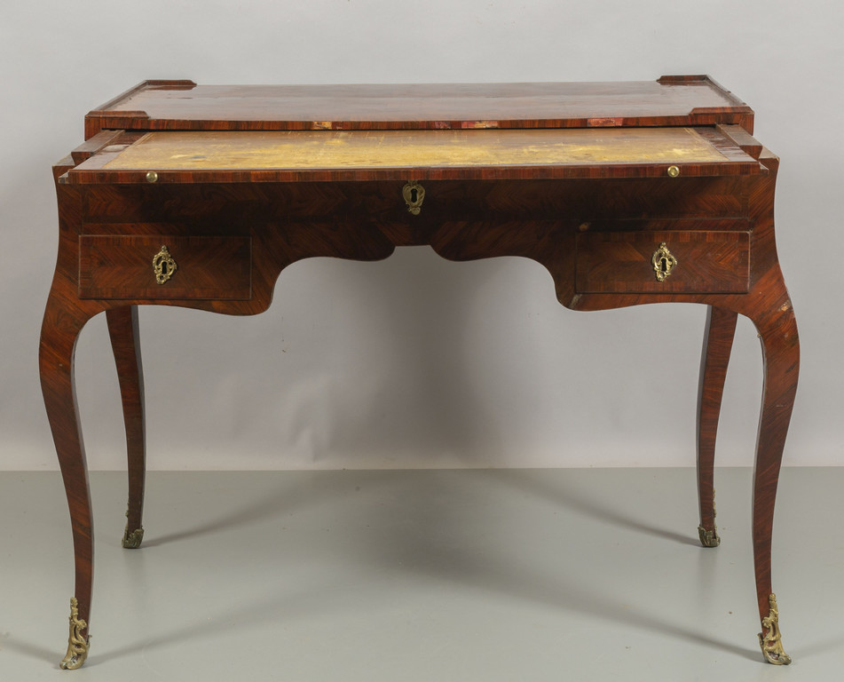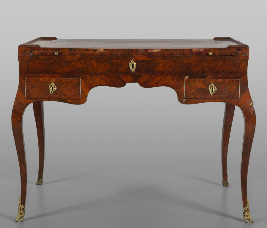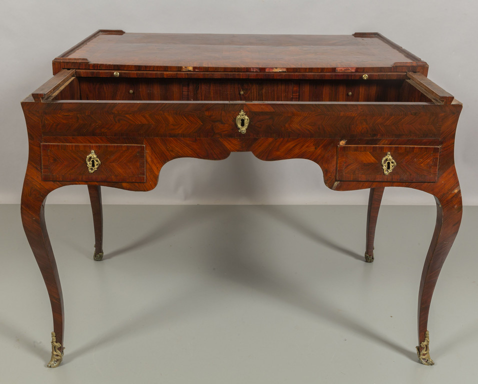 Scrivania Luigi XV da centro lastronata in legni pregiati sul fronte due cassetti laterali piano superiore scorrevole che cela all'interno una serie di cassettini bronzi dorati Napoli I metà sec.XVIII
