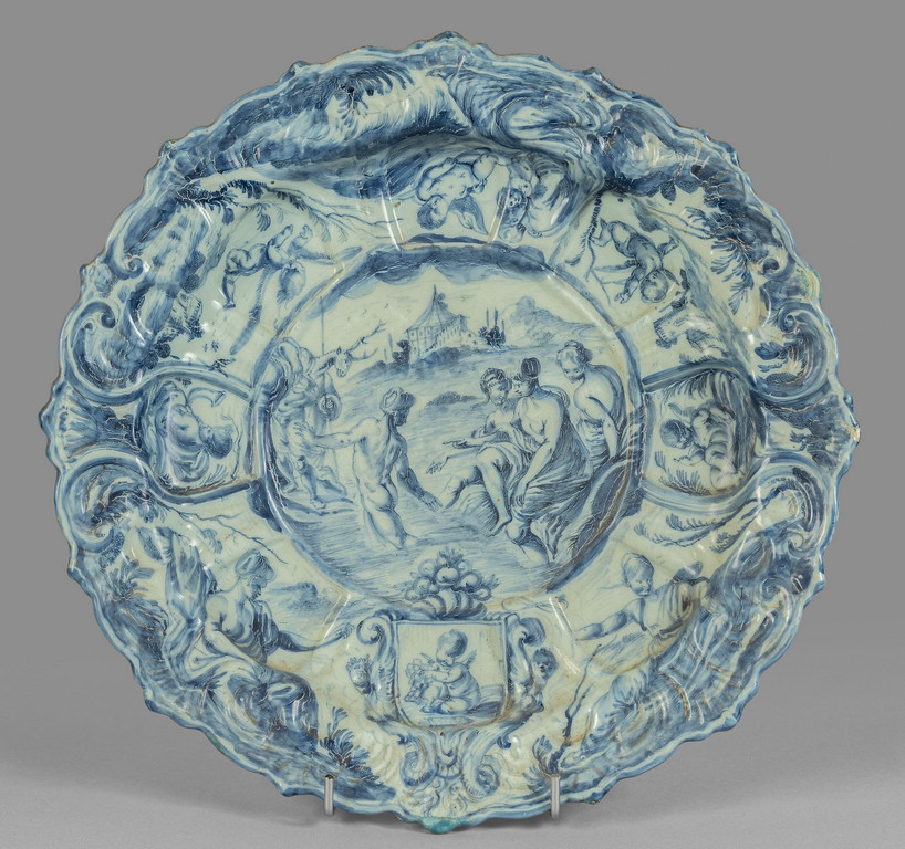 Piatto da parata di forma mossa in ceramica decorato con scena classica al centro del cavetto Savona fine sec. XVII