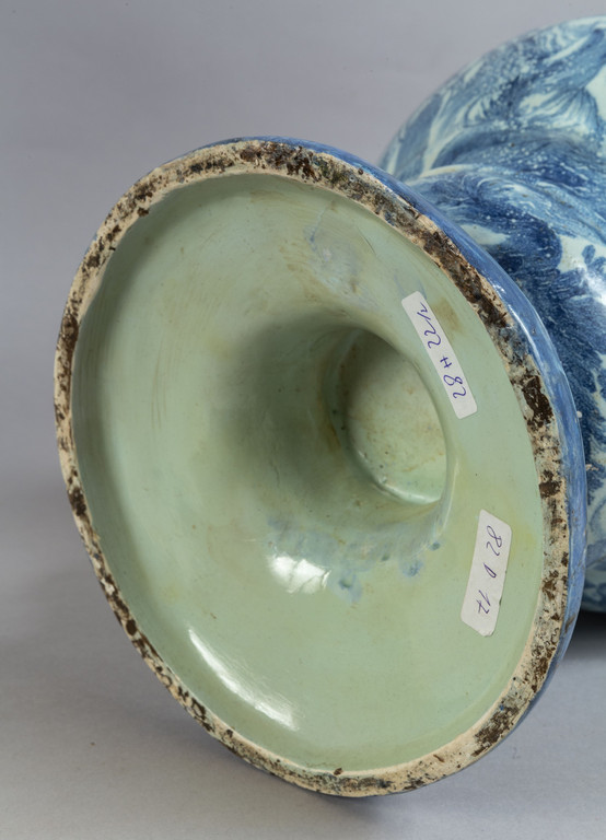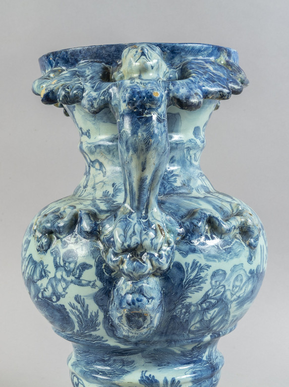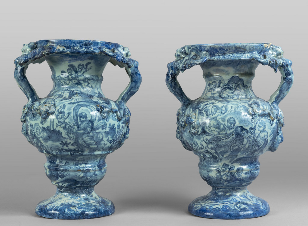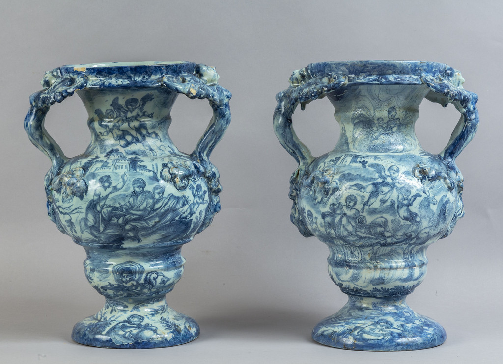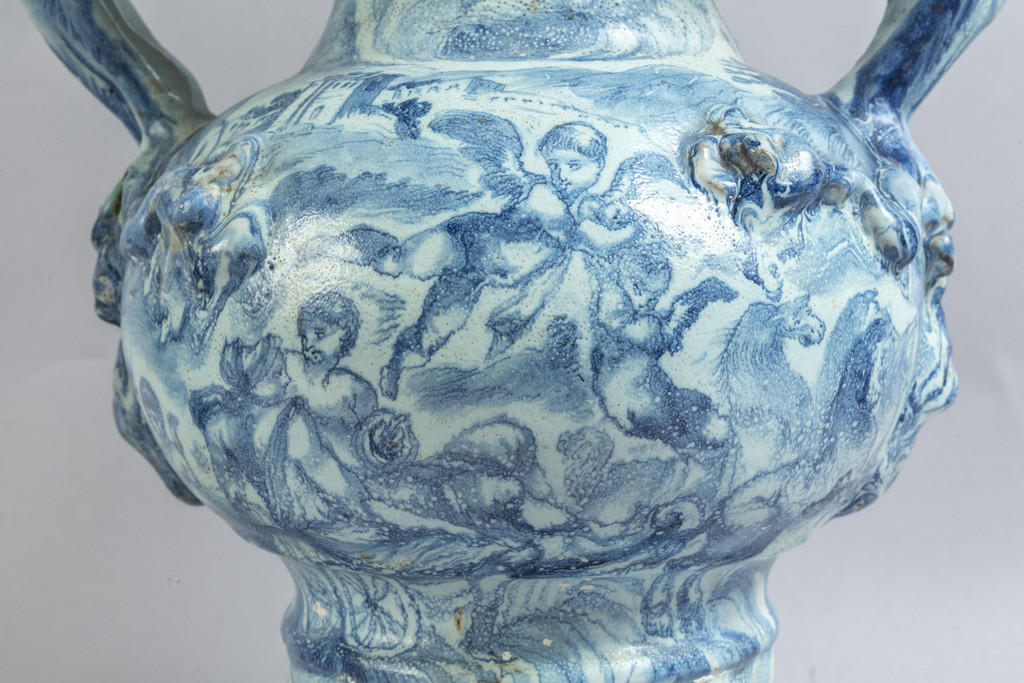 Coppia di importanti vasi in ceramica di Savona decorazione bianca e blu su fondo berrettino prese a forma di Angeli Genova fine sec.XVII