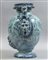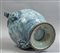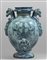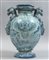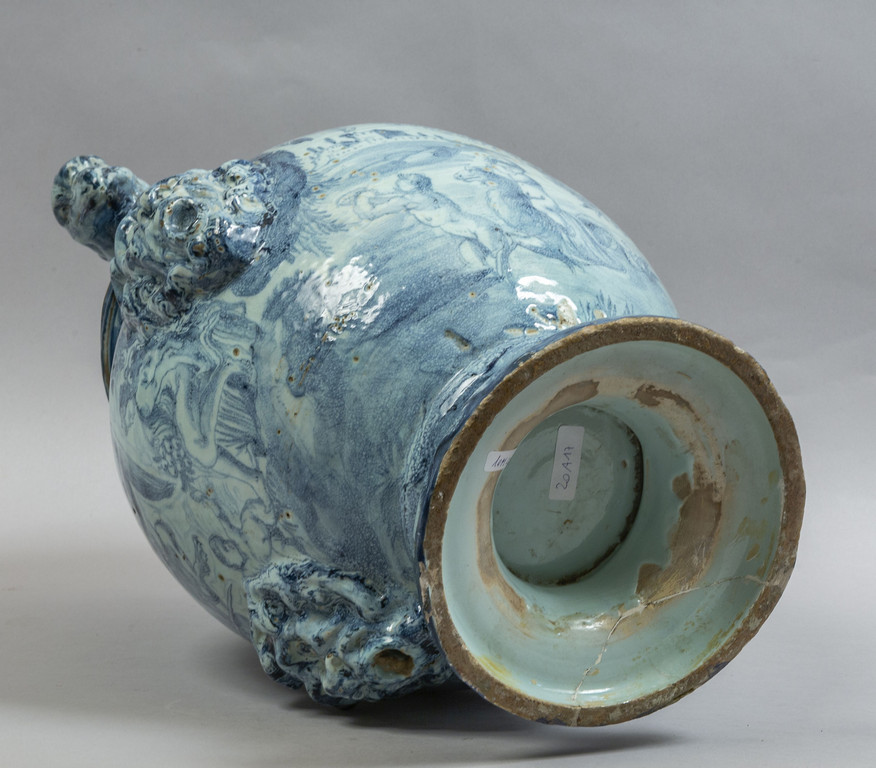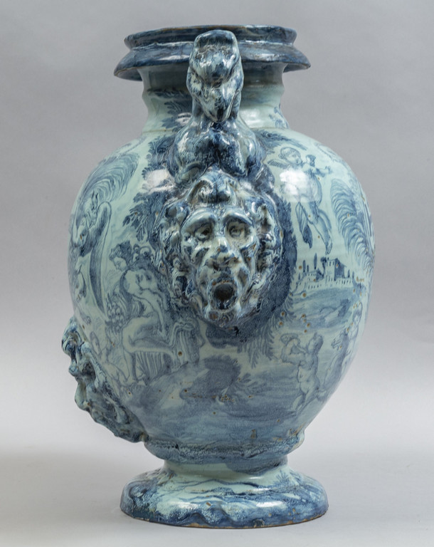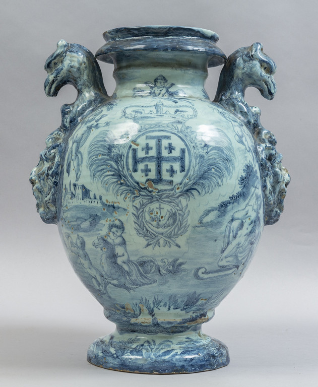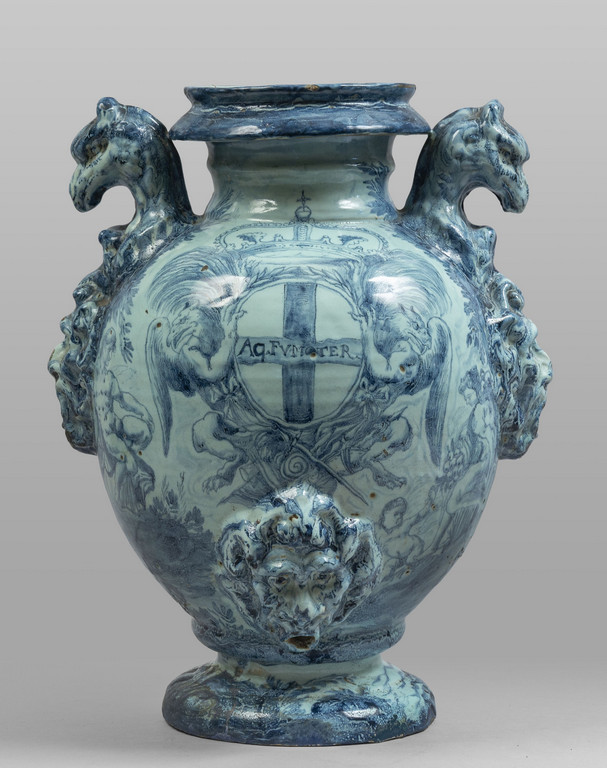 Idria da farmacia in maiolica sul davanti lo stemma coronato di Genova fra due grifoni e due palme domina un largo paesaggio verso la base a rilievo mascherone leonino. Al rovescio largo paesaggio con amorini e figura allegorica centrato da grande stemma coronato dell'Ordine del Santo Sepolcro fra due palme e dal quale pende lo stemma francescano entro due rami d'alloro anse a testa di grifone sostenuto da mascheroni a rilievo. Monocromia turchina su cartone di G.Bartolomeo Guidobono. Manifattura Chiodo di Savona fine sec.XVII