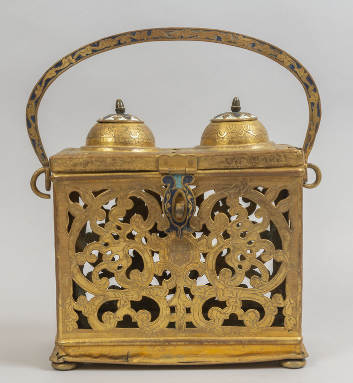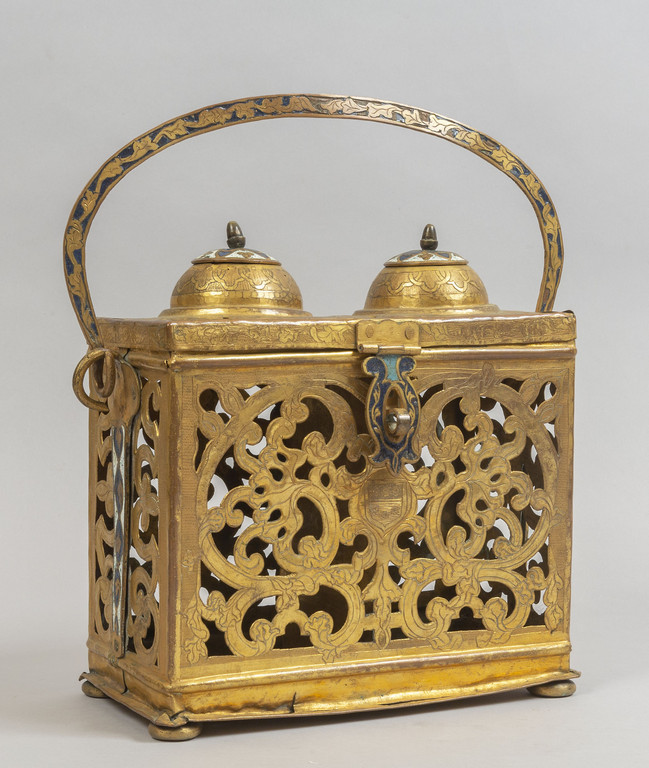 Portabottiglie in rame dorato finemente cesellato con decorazioni e smalti colorati Venezia fine sec.XVI