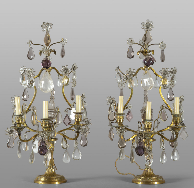 Coppia di grandi girandoles a tre luci montatura in bronzo dorato con ricca decorazione in cristalli e cristallo di rocca fine sec.XIX